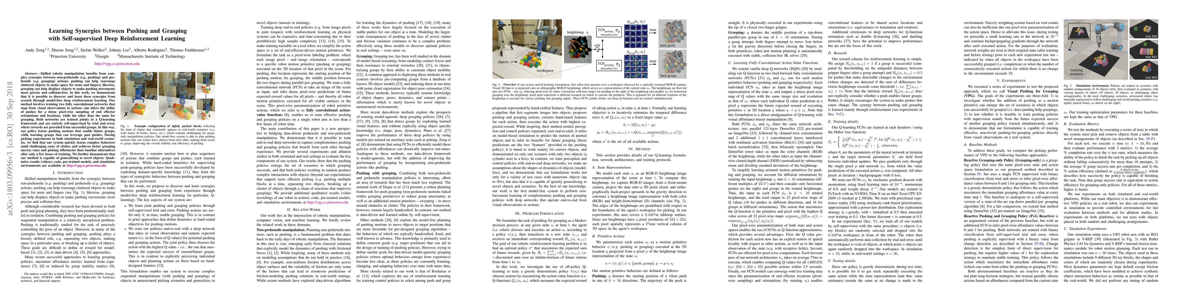 This paper presents a self-supervised deep reinforcement learning method to learn synergies between pushing and grasping in robotic manipulation. The approach trains two convolutional networks to infer actions for pushing and grasping, which are jointly optimized to improve each other's performance, leading to better grasping success rates and picking efficiencies in cluttered environments.