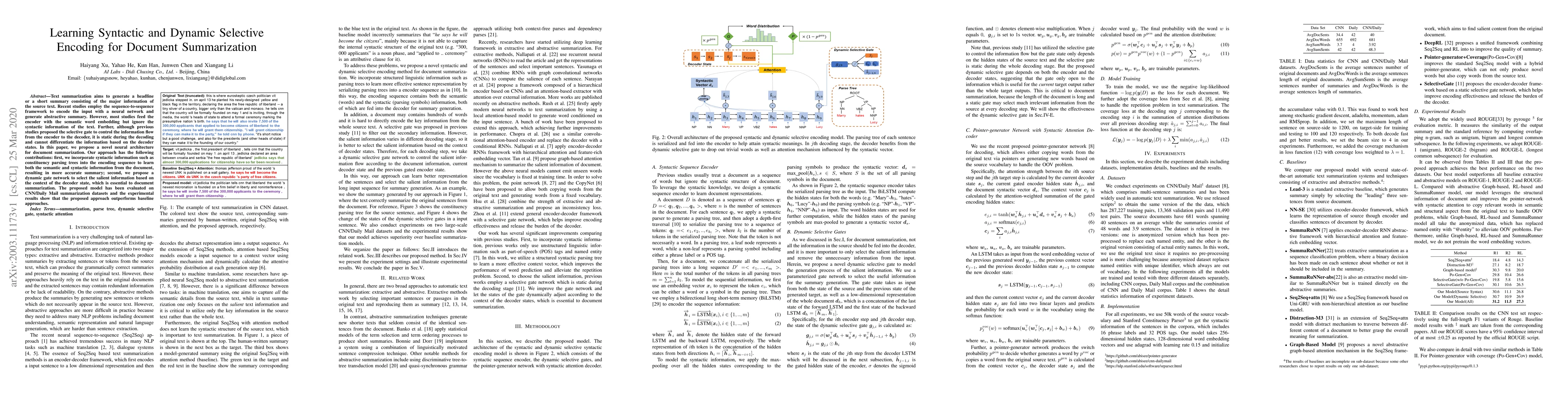 This research paper proposes a novel neural architecture for document summarization that incorporates both syntactic and dynamic selective encoding. By integrating constituency parsing trees and a dynamic gate network, the model aims to generate more accurate summaries compared to traditional sequence-to-sequence frameworks. The results on CNN/Daily Mail datasets demonstrate superior performance over baseline methods.