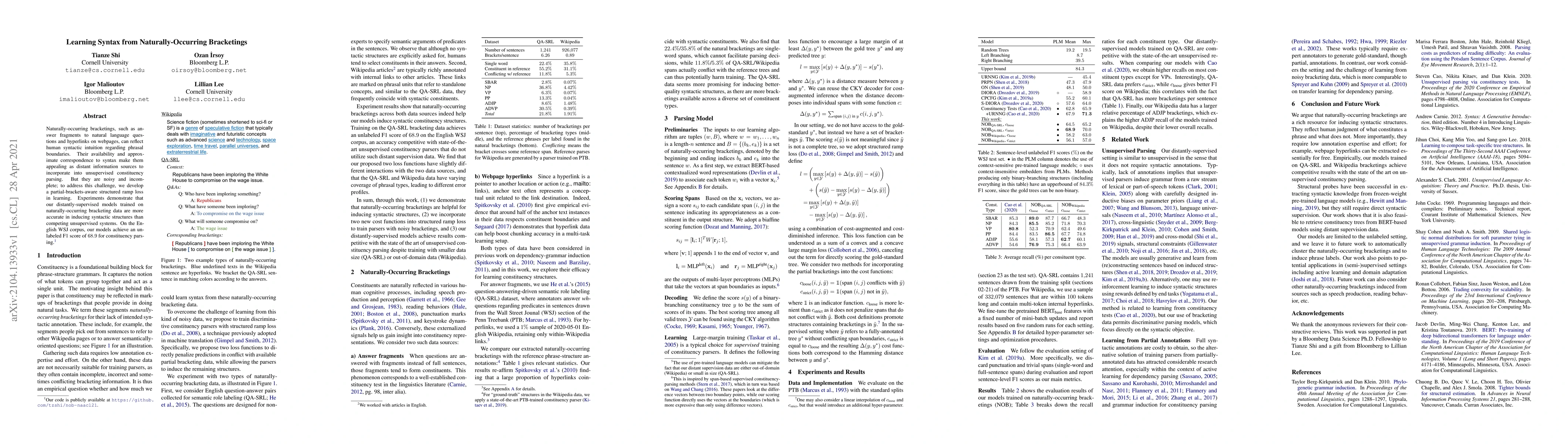 This paper proposes a method to utilize naturally-occurring bracketings for unsupervised syntax learning, addressing their noise and incompleteness with a structured loss. Experiments show improved parsing accuracy, achieving an unlabeled F1 score of 68.9 on the English WSJ corpus.