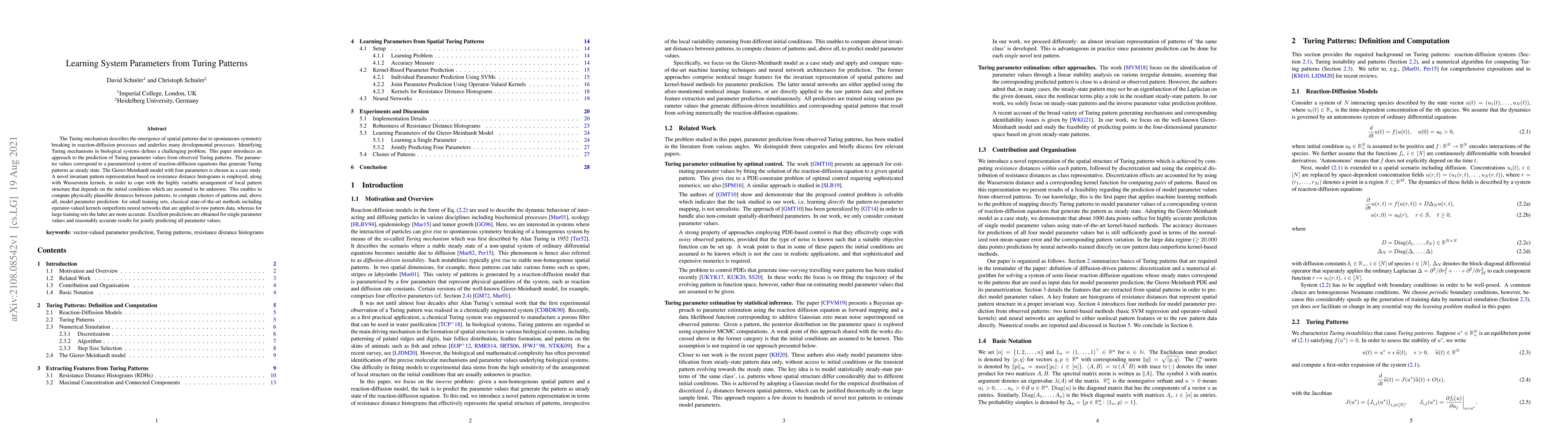 The Turing mechanism describes the emergence of spatial patterns due to spontaneous symmetry breaking in reaction-diffusion processes and underlies many developmental processes. Identifying Turing mechanisms in biological systems defines a challenging problem. This paper introduces an approach to the prediction of Turing parameter values from observed Turing patterns. The parameter values correspond to a parametrized system of reaction-diffusion equations that generate Turing patterns as steady state. The Gierer-Meinhardt model with four parameters is chosen as a case study. A novel invariant pattern representation based on resistance distance histograms is employed, along with Wasserstein kernels, in order to cope with the highly variable arrangement of local pattern structure that depends on the initial conditions which are assumed to be unknown. This enables to compute physically plausible distances between patterns, to compute clusters of patterns and, above all, model parameter prediction: for small training sets, classical state-of-the-art methods including operator-valued kernels outperform neural networks that are applied to raw pattern data, whereas for large training sets the latter are more accurate. Excellent predictions are obtained for single parameter values and reasonably accurate results for jointly predicting all parameter values.