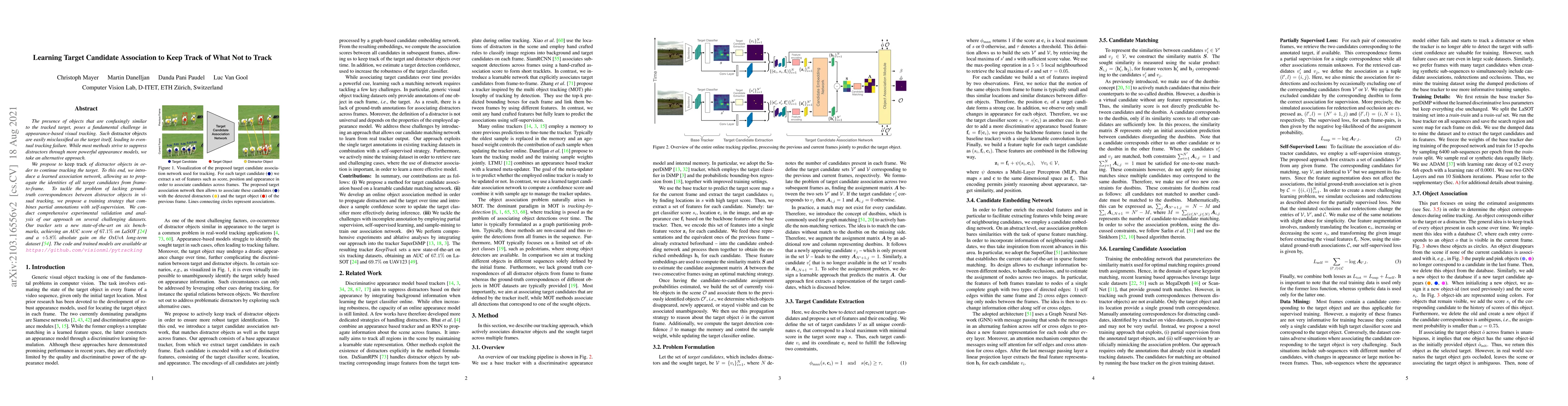 The presence of objects that are confusingly similar to the tracked target, poses a fundamental challenge in appearance-based visual tracking. Such distractor objects are easily misclassified as the target itself, leading to eventual tracking failure. While most methods strive to suppress distractors through more powerful appearance models, we take an alternative approach. We propose to keep track of distractor objects in order to continue tracking the target. To this end, we introduce a learned association network, allowing us to propagate the identities of all target candidates from frame-to-frame. To tackle the problem of lacking ground-truth correspondences between distractor objects in visual tracking, we propose a training strategy that combines partial annotations with self-supervision. We conduct comprehensive experimental validation and analysis of our approach on several challenging datasets. Our tracker sets a new state-of-the-art on six benchmarks, achieving an AUC score of 67.1% on LaSOT and a +5.8% absolute gain on the OxUvA long-term dataset.