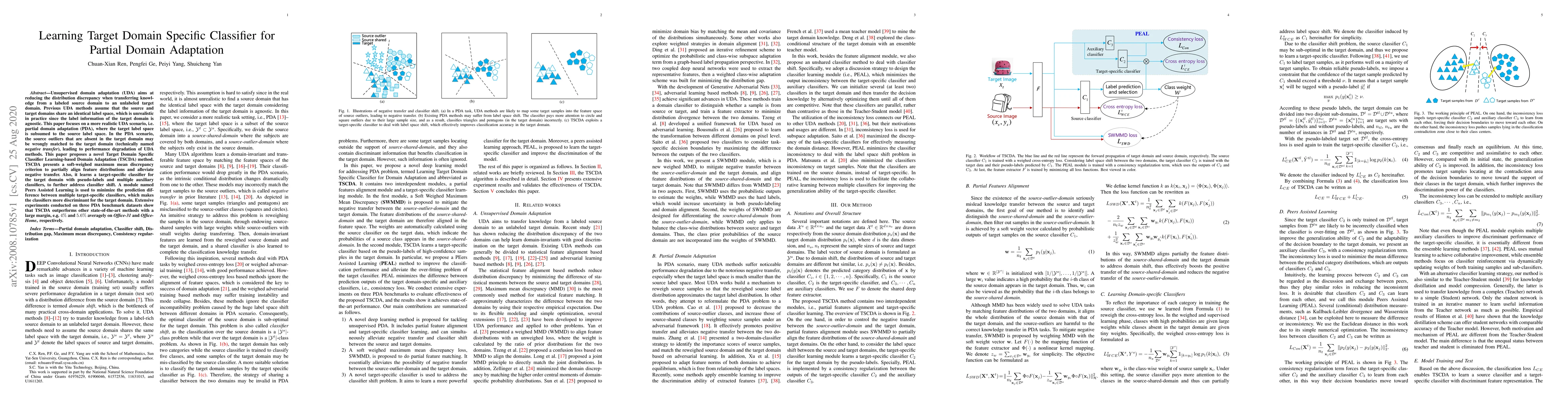 The paper proposes a novel method called Target Domain Specific Classifier Learning-based Domain Adaptation (TSCDA) for partial domain adaptation (PDA), addressing the issue of negative transfer in unsupervised domain adaptation. TSCDA uses a soft-weighted maximum mean discrepancy criterion, target-specific classifiers with pseudo-labels, and a Peers Assisted Learning module to outperform existing methods on benchmark datasets like Office-31 and Office-Home.