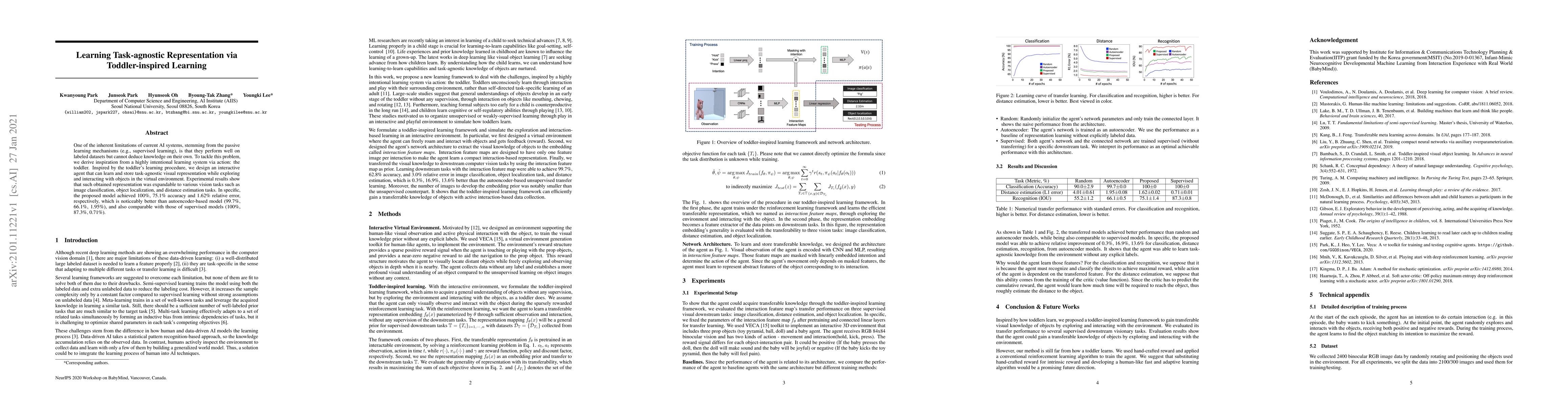 One of the inherent limitations of current AI systems, stemming from the passive learning mechanisms (e.g., supervised learning), is that they perform well on labeled datasets but cannot deduce knowledge on their own. To tackle this problem, we derive inspiration from a highly intentional learning system via action: the toddler. Inspired by the toddler's learning procedure, we design an interactive agent that can learn and store task-agnostic visual representation while exploring and interacting with objects in the virtual environment. Experimental results show that such obtained representation was expandable to various vision tasks such as image classification, object localization, and distance estimation tasks. In specific, the proposed model achieved 100%, 75.1% accuracy and 1.62% relative error, respectively, which is noticeably better than autoencoder-based model (99.7%, 66.1%, 1.95%), and also comparable with those of supervised models (100%, 87.3%, 0.71%).