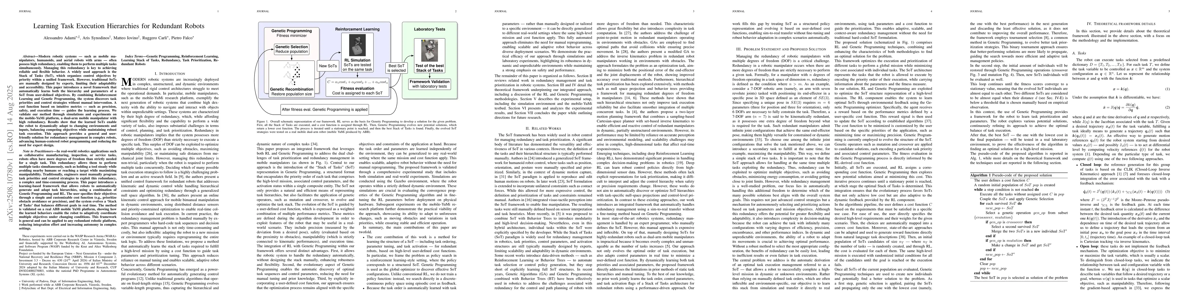 Modern robotic systems, such as mobile manipulators, humanoids, and aerial robots with arms, often possess high redundancy, enabling them to perform multiple tasks simultaneously. Managing this redundancy is key to achieving reliable and flexible behavior. A widely used approach is the Stack of Tasks (SoT), which organizes control objectives by priority within a unified framework. However, traditional SoTs are manually designed by experts, limiting their adaptability and accessibility. This paper introduces a novel framework that automatically learns both the hierarchy and parameters of a SoT from user-defined objectives. By combining Reinforcement Learning and Genetic Programming, the system discovers task priorities and control strategies without manual intervention. A cost function based on intuitive metrics such as precision, safety, and execution time guides the learning process. We validate our method through simulations and experiments on the mobile-YuMi platform, a dual-arm mobile manipulator with high redundancy. Results show that the learned SoTs enable the robot to dynamically adapt to changing environments and inputs, balancing competing objectives while maintaining robust task execution. This approach provides a general and user-friendly solution for redundancy management in complex robots, advancing human-centered robot programming and reducing the need for expert design.