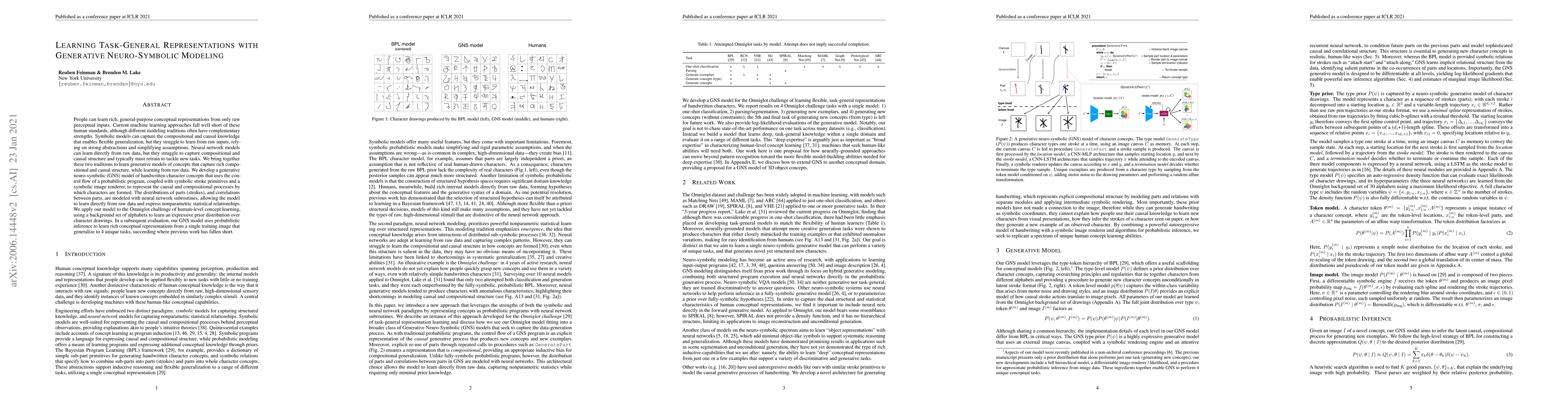 People can learn rich, general-purpose conceptual representations from only raw perceptual inputs. Current machine learning approaches fall well short of these human standards, although different modeling traditions often have complementary strengths. Symbolic models can capture the compositional and causal knowledge that enables flexible generalization, but they struggle to learn from raw inputs, relying on strong abstractions and simplifying assumptions. Neural network models can learn directly from raw data, but they struggle to capture compositional and causal structure and typically must retrain to tackle new tasks. We bring together these two traditions to learn generative models of concepts that capture rich compositional and causal structure, while learning from raw data. We develop a generative neuro-symbolic (GNS) model of handwritten character concepts that uses the control flow of a probabilistic program, coupled with symbolic stroke primitives and a symbolic image renderer, to represent the causal and compositional processes by which characters are formed. The distributions of parts (strokes), and correlations between parts, are modeled with neural network subroutines, allowing the model to learn directly from raw data and express nonparametric statistical relationships. We apply our model to the Omniglot challenge of human-level concept learning, using a background set of alphabets to learn an expressive prior distribution over character drawings. In a subsequent evaluation, our GNS model uses probabilistic inference to learn rich conceptual representations from a single training image that generalize to 4 unique tasks, succeeding where previous work has fallen short.
