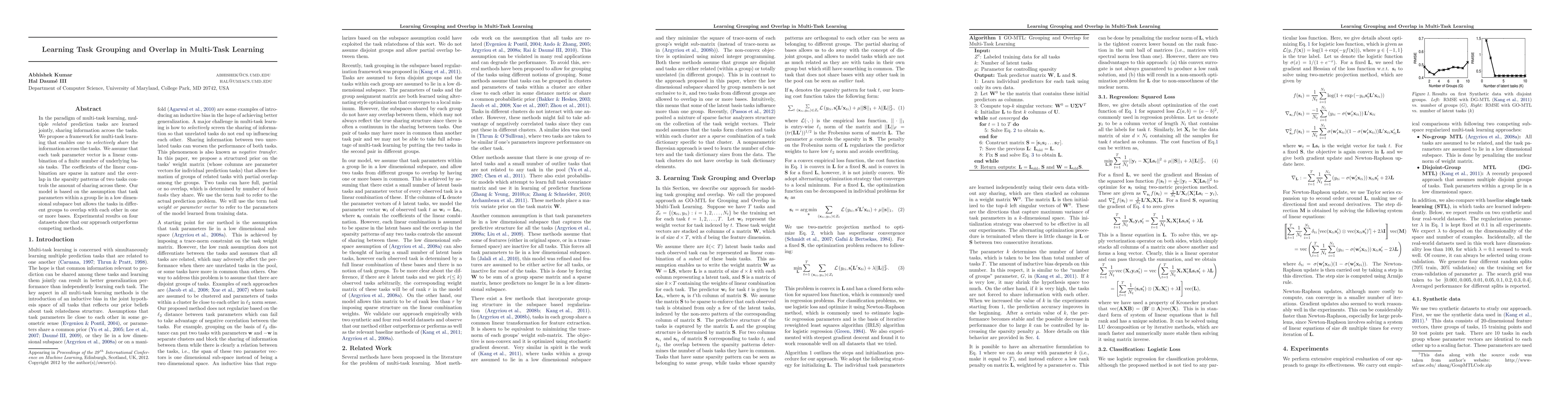 In the paradigm of multi-task learning, mul- tiple related prediction tasks are learned jointly, sharing information across the tasks. We propose a framework for multi-task learn- ing that enables one to selectively share the information across the tasks. We assume that each task parameter vector is a linear combi- nation of a finite number of underlying basis tasks. The coefficients of the linear combina- tion are sparse in nature and the overlap in the sparsity patterns of two tasks controls the amount of sharing across these. Our model is based on on the assumption that task pa- rameters within a group lie in a low dimen- sional subspace but allows the tasks in differ- ent groups to overlap with each other in one or more bases. Experimental results on four datasets show that our approach outperforms competing methods.