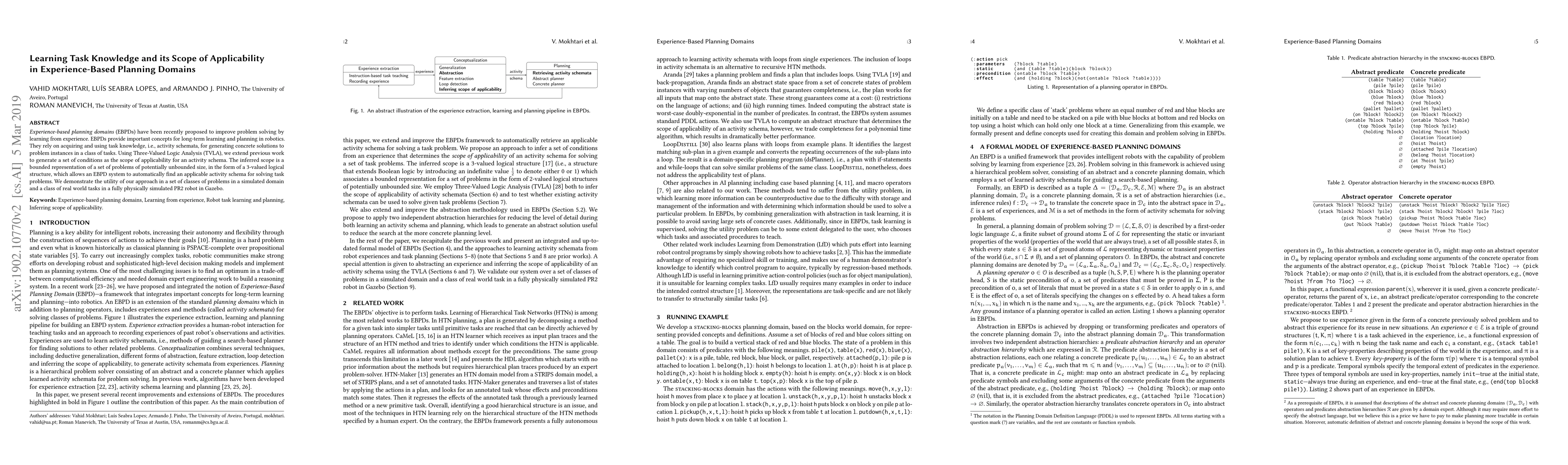 Experience-based planning domains (EBPDs) have been recently proposed to improve problem solving by learning from experience. EBPDs provide important concepts for long-term learning and planning in robotics. They rely on acquiring and using task knowledge, i.e., activity schemata, for generating concrete solutions to problem instances in a class of tasks. Using Three-Valued Logic Analysis (TVLA), we extend previous work to generate a set of conditions as the scope of applicability for an activity schema. The inferred scope is a bounded representation of a set of problems of potentially unbounded size, in the form of a 3-valued logical structure, which allows an EBPD system to automatically find an applicable activity schema for solving task problems. We demonstrate the utility of our approach in a set of classes of problems in a simulated domain and a class of real world tasks in a fully physically simulated PR2 robot in Gazebo.
