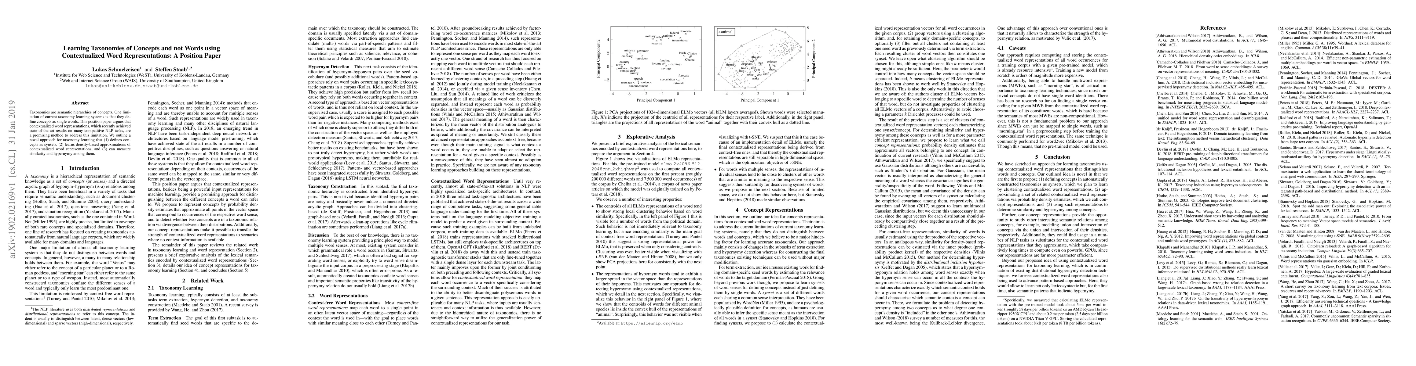 Taxonomies are semantic hierarchies of concepts. One limitation of current taxonomy learning systems is that they define concepts as single words. This position paper argues that contextualized word representations, which recently achieved state-of-the-art results on many competitive NLP tasks, are a promising method to address this limitation. We outline a novel approach for taxonomy learning that (1) defines concepts as synsets, (2) learns density-based approximations of contextualized word representations, and (3) can measure similarity and hypernymy among them.
