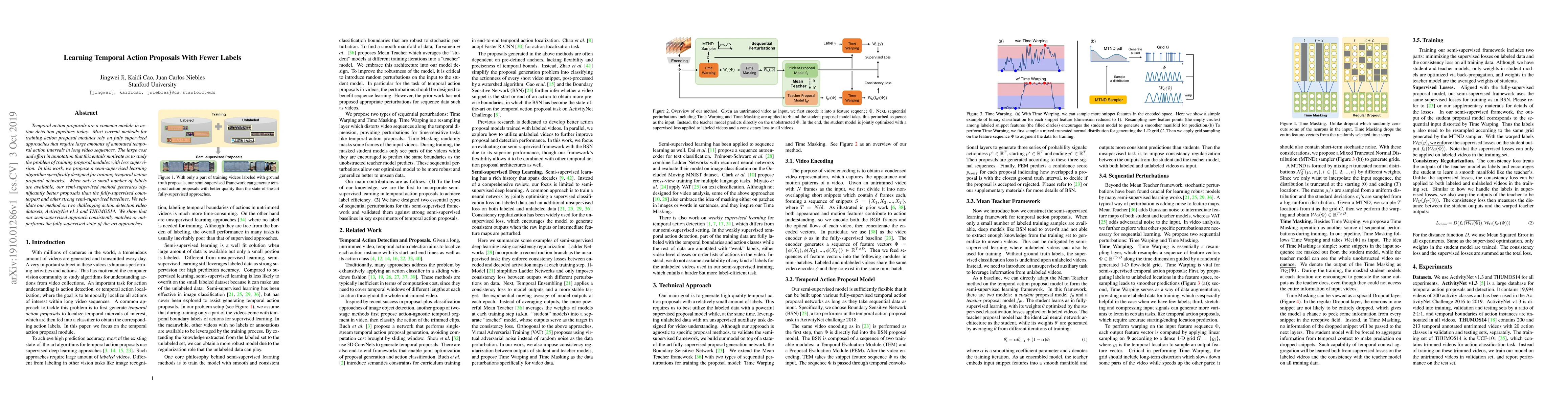 This paper proposes a semi-supervised learning algorithm to train temporal action proposal networks with fewer labels, significantly outperforming fully-supervised methods and other semi-supervised baselines on ActivityNet v1.3 and THUMOS14 datasets.