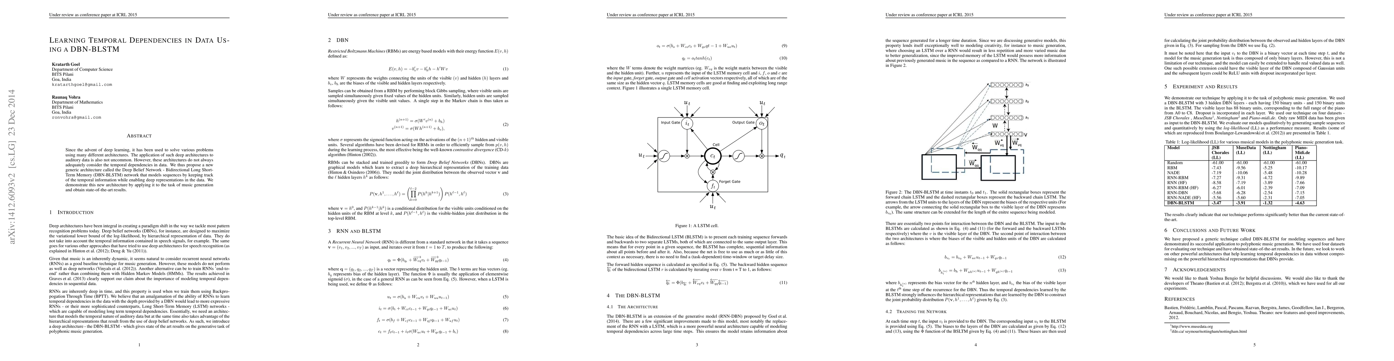 This paper proposes a DBN-BLSTM network to model temporal dependencies in data, particularly for auditory sequences, achieving state-of-the-art results in the task of music generation. The architecture combines deep representations with temporal information tracking.
