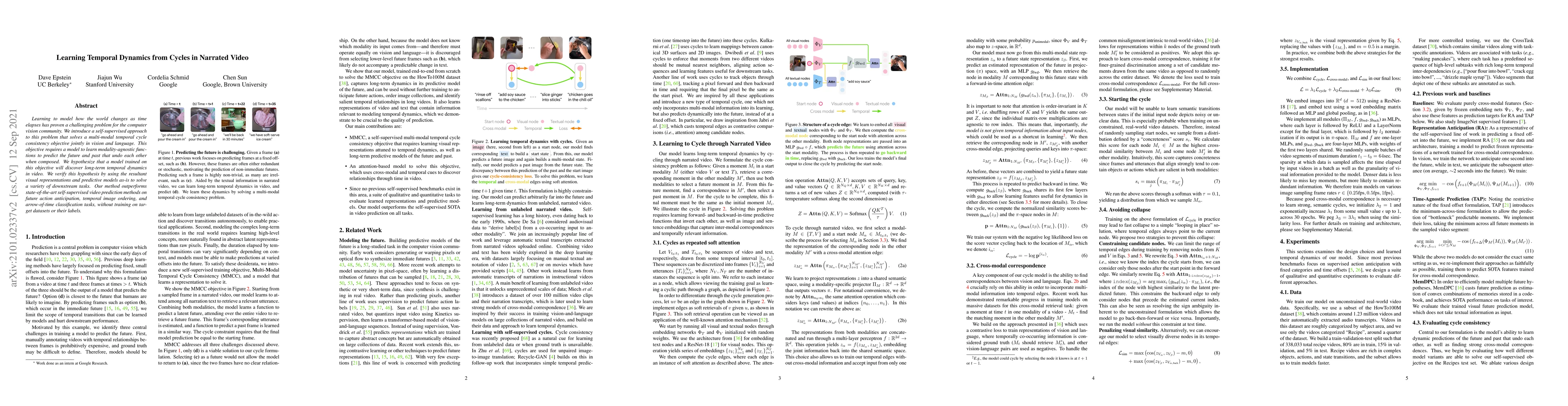 This paper proposes a self-supervised method to model temporal dynamics in narrated video using temporal cycle consistency across vision and language. The model learns high-level transitions by enforcing a cycle consistency constraint, which enables it to predict forward and backward in time, demonstrating effectiveness in tasks like future action prediction and temporal image ordering.