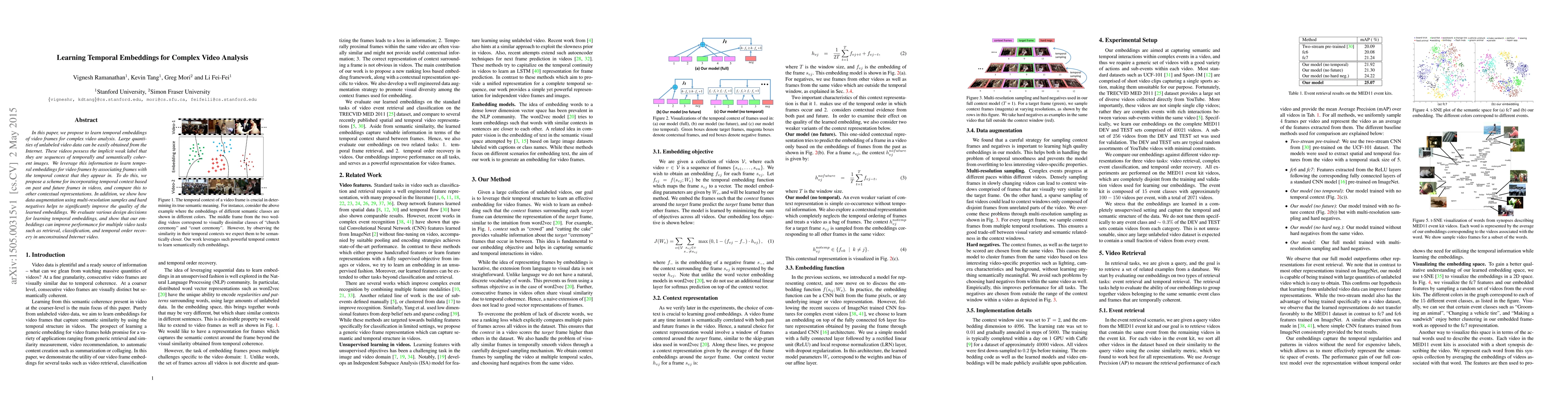 In this paper, we propose to learn temporal embeddings of video frames for complex video analysis. Large quantities of unlabeled video data can be easily obtained from the Internet. These videos possess the implicit weak label that they are sequences of temporally and semantically coherent images. We leverage this information to learn temporal embeddings for video frames by associating frames with the temporal context that they appear in. To do this, we propose a scheme for incorporating temporal context based on past and future frames in videos, and compare this to other contextual representations. In addition, we show how data augmentation using multi-resolution samples and hard negatives helps to significantly improve the quality of the learned embeddings. We evaluate various design decisions for learning temporal embeddings, and show that our embeddings can improve performance for multiple video tasks such as retrieval, classification, and temporal order recovery in unconstrained Internet video.