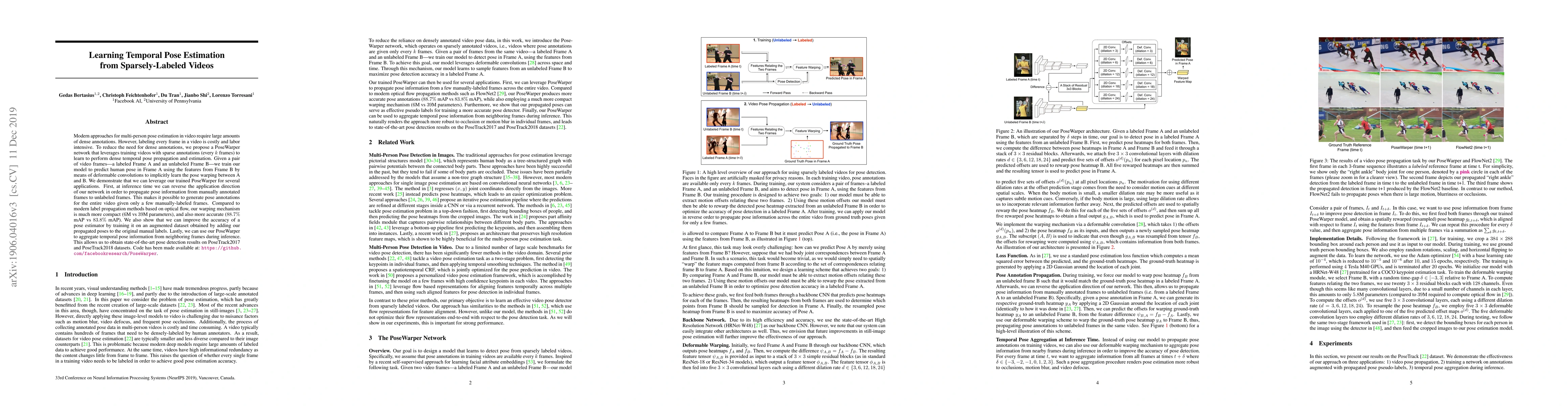 A new method called PoseWarper reduces the need for dense annotations in video pose estimation by leveraging sparse annotations to learn temporal pose propagation and estimation, achieving state-of-the-art results on key datasets.