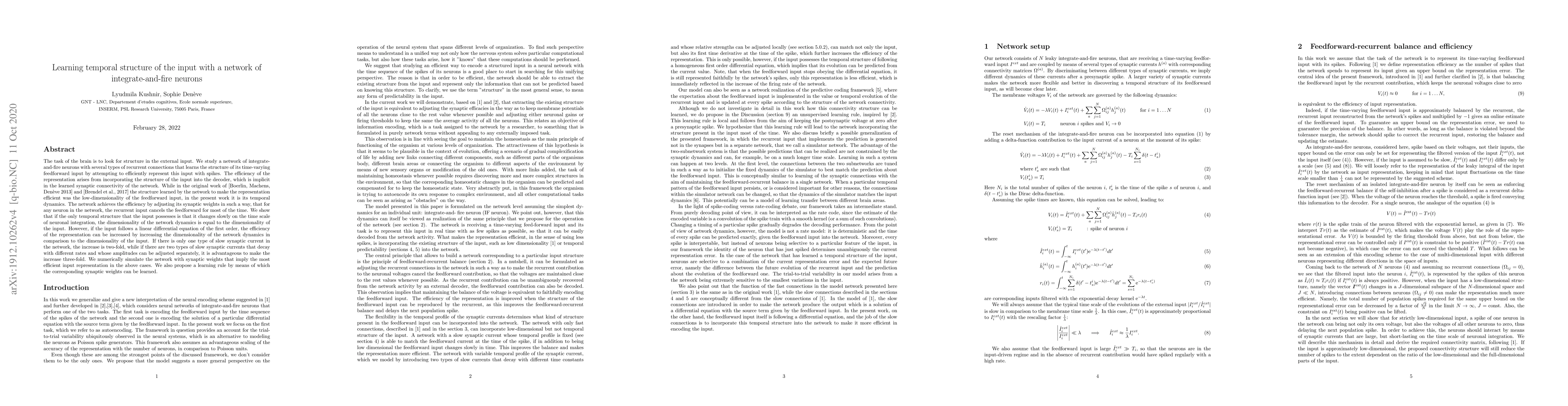 The task of the brain is to look for structure in the external input. We study a network of integrate-and-fire neurons with several types of recurrent connections that learns the structure of its time-varying feedforward input by attempting to efficiently represent this input with spikes. The efficiency of the representation arises from incorporating the structure of the input into the decoder, which is implicit in the learned synaptic connectivity of the network. While in the original work of [Boerlin, Machens, Den\`eve 2013] and [Brendel et al., 2017] the structure learned by the network to make the representation efficient was the low-dimensionality of the feedforward input, in the present work it is its temporal dynamics. The network achieves the efficiency by adjusting its synaptic weights in such a way, that for any neuron in the network, the recurrent input cancels the feedforward for most of the time. We show that if the only temporal structure that the input possesses is that it changes slowly on the time scale of neuronal integration, the dimensionality of the network dynamics is equal to the dimensionality of the input. However, if the input follows a linear differential equation of the first order, the efficiency of the representation can be increased by increasing the dimensionality of the network dynamics in comparison to the dimensionality of the input. If there is only one type of slow synaptic current in the network, the increase is two-fold, while if there are two types of slow synaptic currents that decay with different rates and whose amplitudes can be adjusted separately, it is advantageous to make the increase three-fold. We numerically simulate the network with synaptic weights that imply the most efficient input representation in the above cases. We also propose a learning rule by means of which the corresponding synaptic weights can be learned.