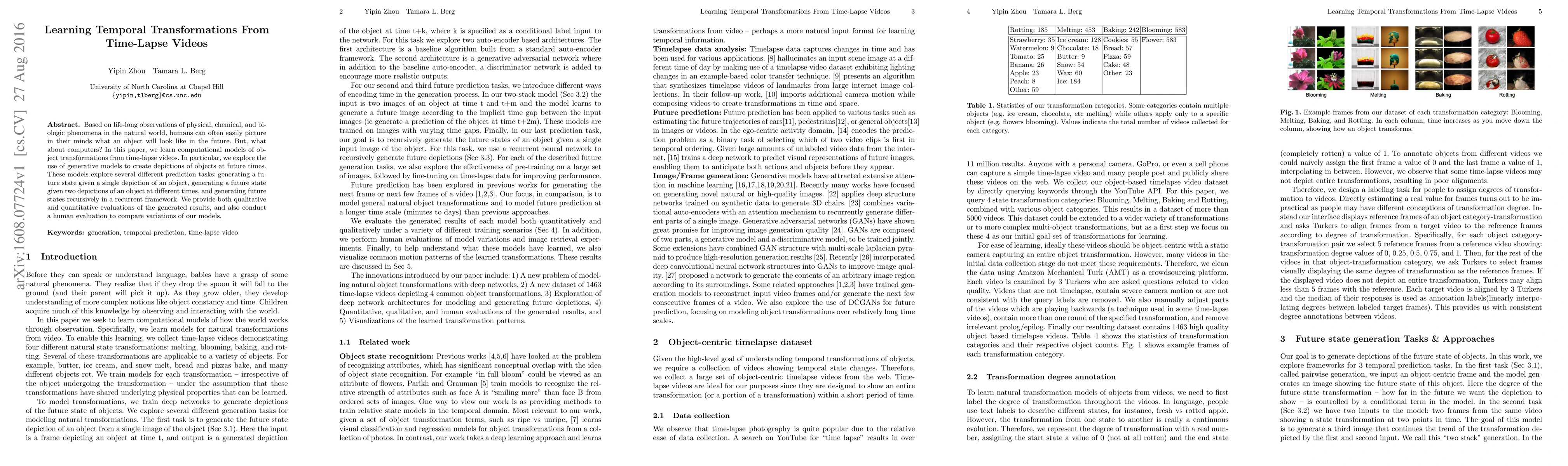 Based on life-long observations of physical, chemical, and biologic phenomena in the natural world, humans can often easily picture in their minds what an object will look like in the future. But, what about computers? In this paper, we learn computational models of object transformations from time-lapse videos. In particular, we explore the use of generative models to create depictions of objects at future times. These models explore several different prediction tasks: generating a future state given a single depiction of an object, generating a future state given two depictions of an object at different times, and generating future states recursively in a recurrent framework. We provide both qualitative and quantitative evaluations of the generated results, and also conduct a human evaluation to compare variations of our models.