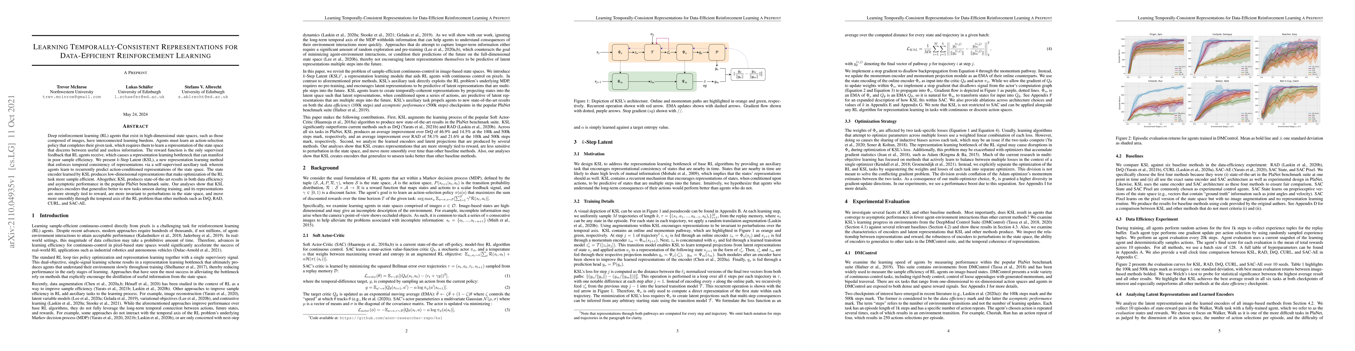 Deep reinforcement learning (RL) agents that exist in high-dimensional state spaces, such as those composed of images, have interconnected learning burdens. Agents must learn an action-selection policy that completes their given task, which requires them to learn a representation of the state space that discerns between useful and useless information. The reward function is the only supervised feedback that RL agents receive, which causes a representation learning bottleneck that can manifest in poor sample efficiency. We present $k$-Step Latent (KSL), a new representation learning method that enforces temporal consistency of representations via a self-supervised auxiliary task wherein agents learn to recurrently predict action-conditioned representations of the state space. The state encoder learned by KSL produces low-dimensional representations that make optimization of the RL task more sample efficient. Altogether, KSL produces state-of-the-art results in both data efficiency and asymptotic performance in the popular PlaNet benchmark suite. Our analyses show that KSL produces encoders that generalize better to new tasks unseen during training, and its representations are more strongly tied to reward, are more invariant to perturbations in the state space, and move more smoothly through the temporal axis of the RL problem than other methods such as DrQ, RAD, CURL, and SAC-AE.