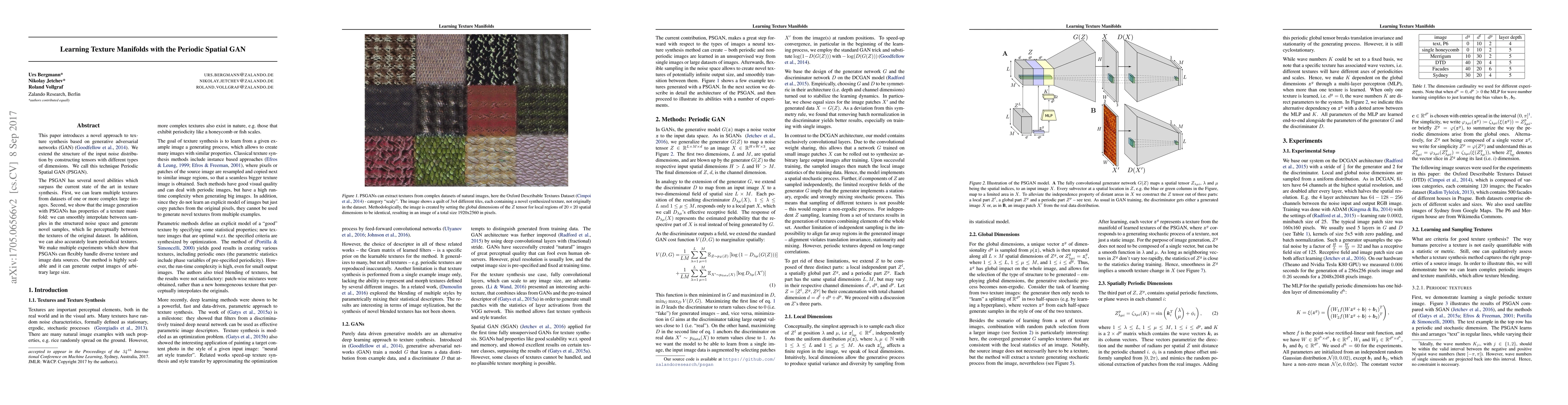 This paper introduces Periodic Spatial GANs for texture synthesis, allowing the generation of multiple textures from a single dataset and producing novel samples between them. It also achieves accurate learning of periodical textures and demonstrates high scalability in generating large output images.