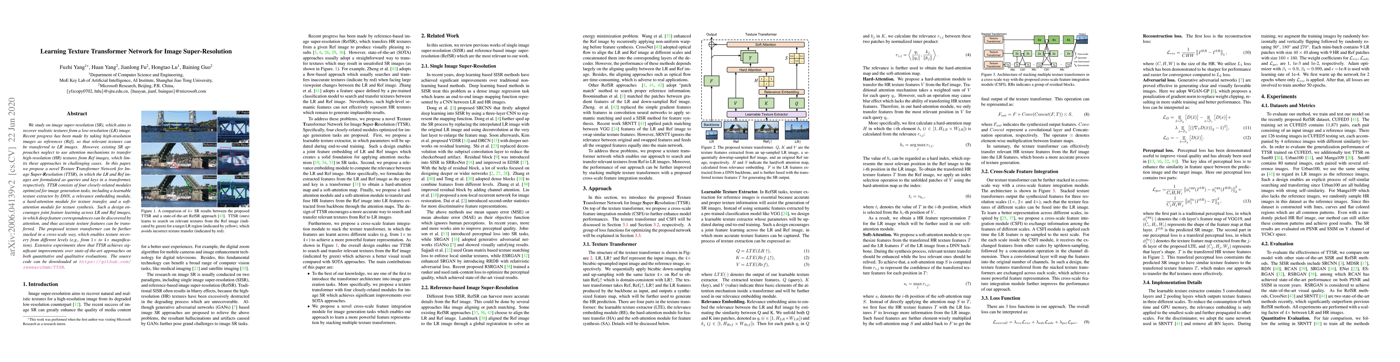 This paper proposes a Texture Transformer Network (TTSR) for image super-resolution, utilizing attention mechanisms to transfer high-resolution textures from reference images to low-resolution inputs. The network includes modules for texture extraction, relevance embedding, and attention-based texture transfer, achieving superior results compared to existing methods.