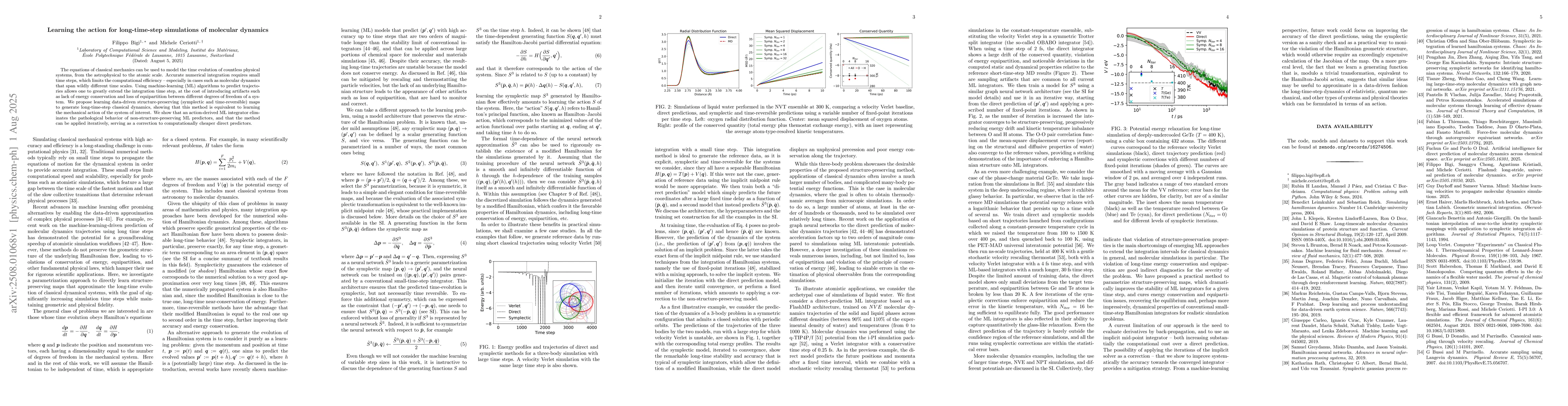 The equations of classical mechanics can be used to model the time evolution of countless physical systems, from the astrophysical to the atomic scale. Accurate numerical integration requires small time steps, which limits the computational efficiency -- especially in cases such as molecular dynamics that span wildly different time scales. Using machine-learning (ML) algorithms to predict trajectories allows one to greatly extend the integration time step, at the cost of introducing artifacts such as lack of energy conservation and loss of equipartition between different degrees of freedom of a system. We propose learning data-driven structure-preserving (symplectic and time-reversible) maps to generate long-time-step classical dynamics, showing that this method is equivalent to learning the mechanical action of the system of interest. We show that an action-derived ML integrator eliminates the pathological behavior of non-structure-preserving ML predictors, and that the method can be applied iteratively, serving as a correction to computationally cheaper direct predictors.