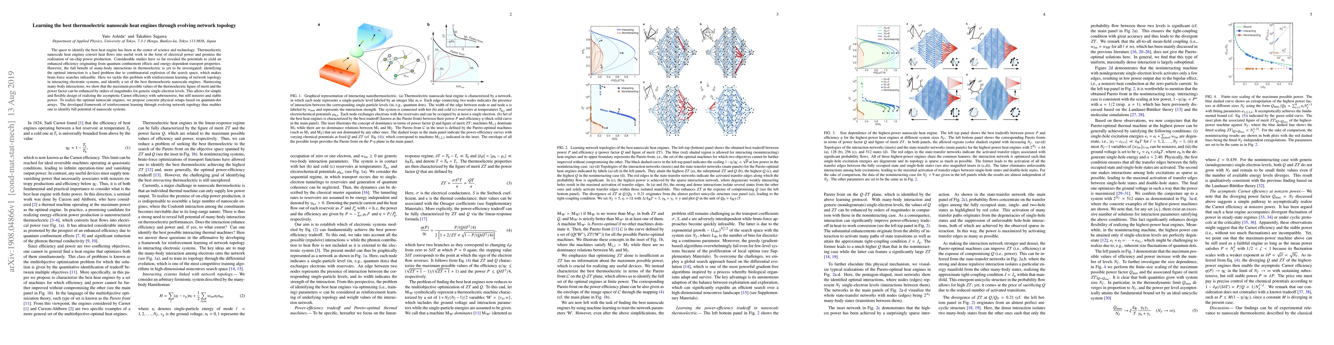 The quest to identify the best heat engine has been at the center of science and technology. Thermoelectric nanoscale heat engines convert heat flows into useful work in the form of electrical power and promise the realization of on-chip power production. Considerable studies have so far revealed the potentials to yield an enhanced efficiency originating from quantum confinement effects and energy-dependent transport properties. However, the full benefit of many-body interactions in thermoelectric is yet to be investigated; identifying the optimal interaction is a hard problem due to combinatorial explosion of the search space, which makes brute-force searches infeasible. Here we tackle this problem with reinforcement learning of network topology in interacting electronic systems, and identify a set of the best thermoelectric nanoscale engines. Harnessing many-body interactions, we show that the maximum possible values of the thermoelectric figure of merit and the power factor can be enhanced by orders of magnitudes for generic single-electron levels. This allows for simple and flexible design of realizing the asymptotic Carnot efficiency with subextensive, but still nonzero and stable power. To realize the optimal nanoscale engines, we propose concrete physical setups based on quantum-dot arrays. The developed framework of reinforcement learning through evolving network topology thus enables one to identify full potential of nanoscale systems.