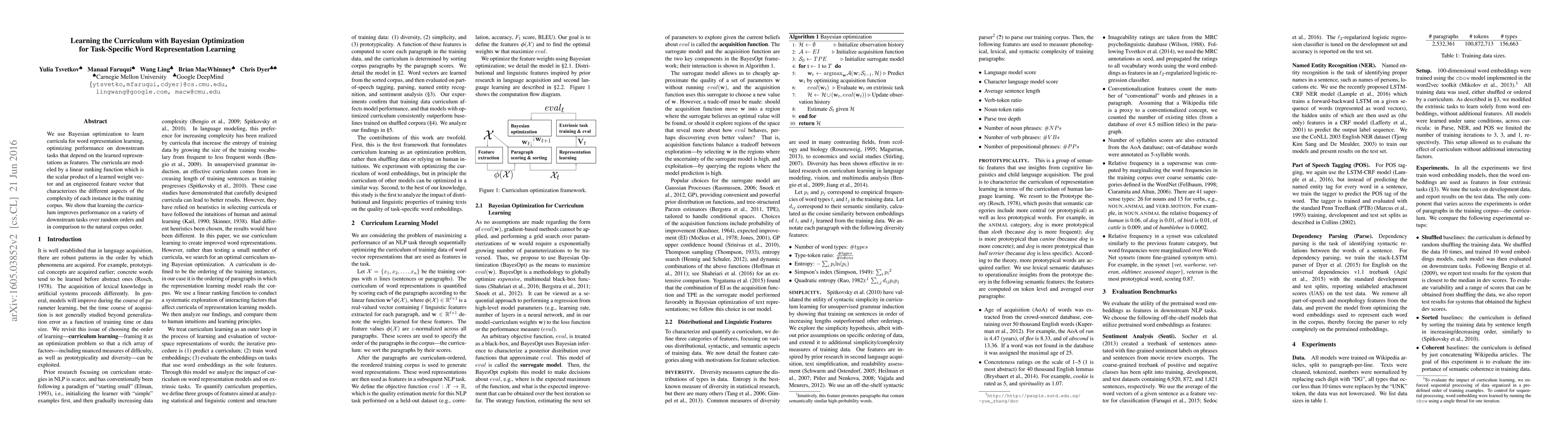 We use Bayesian optimization to learn curricula for word representation learning, optimizing performance on downstream tasks that depend on the learned representations as features. The curricula are modeled by a linear ranking function which is the scalar product of a learned weight vector and an engineered feature vector that characterizes the different aspects of the complexity of each instance in the training corpus. We show that learning the curriculum improves performance on a variety of downstream tasks over random orders and in comparison to the natural corpus order.