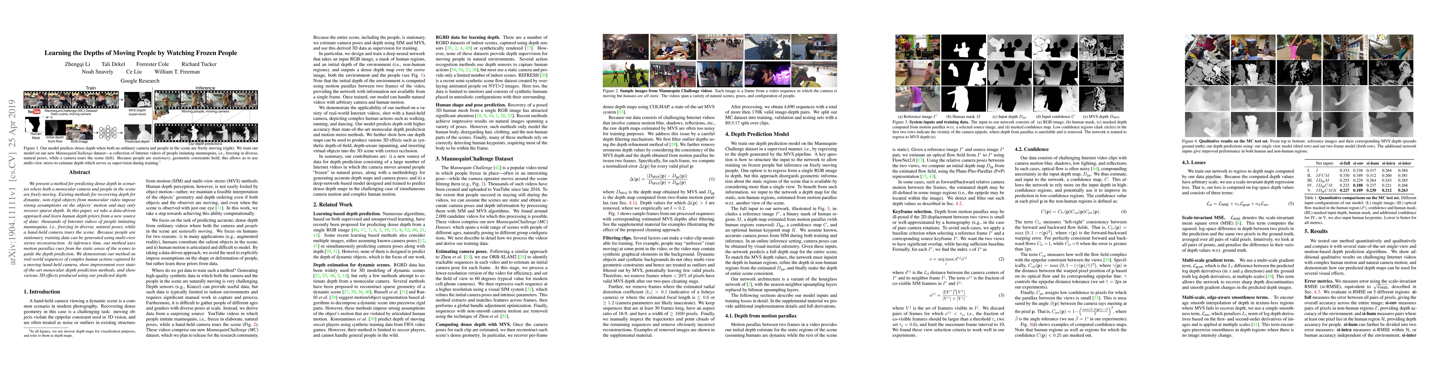 The paper presents a data-driven approach to predict human depth in dynamic scenes using a monocular camera. It leverages a new dataset of Internet videos where people freeze in diverse poses, allowing for multi-view stereo reconstruction during training. At inference, motion parallax cues from static scene areas guide depth prediction.