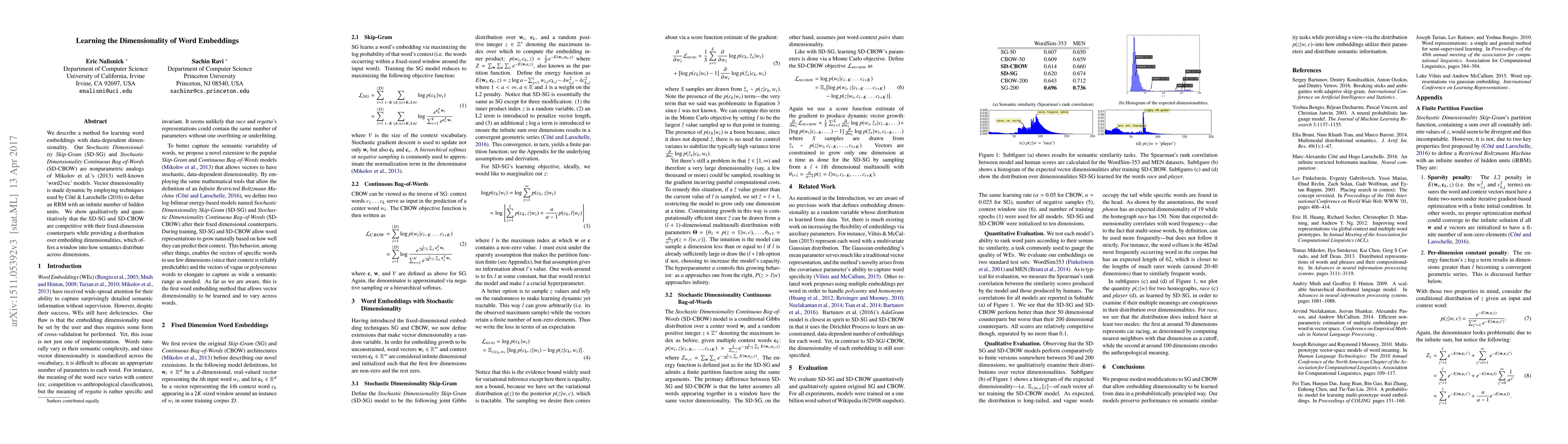 This paper proposes Stochastic Dimensionality Skip-Gram (SD-SG) and Stochastic Dimensionality Continuous Bag-of-Words (SD-CBOW) models for learning word embeddings with dynamic dimensionality, inspired by infinite hidden units in RBMs. These methods are competitive with fixed-dimension word2vec models while offering insights into how semantics distribute across dimensions.