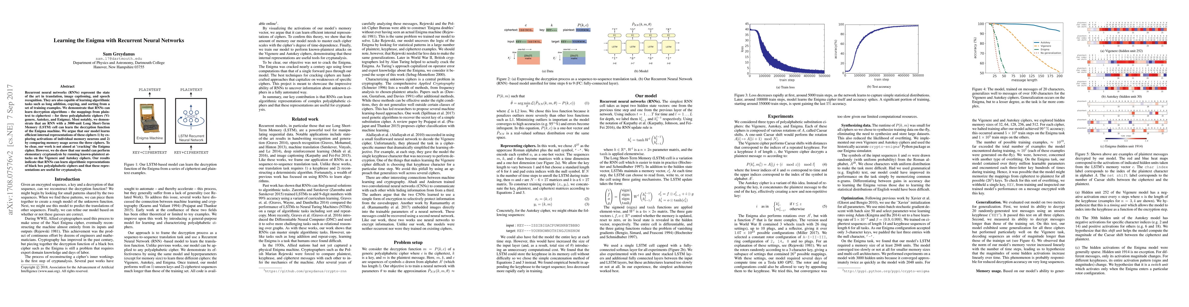 Researchers show that Recurrent Neural Networks can learn decryption algorithms for polyalphabetic ciphers like Enigma, enabling cryptanalysis, while emphasizing the focus is on understanding internal representations rather than cracking codes.