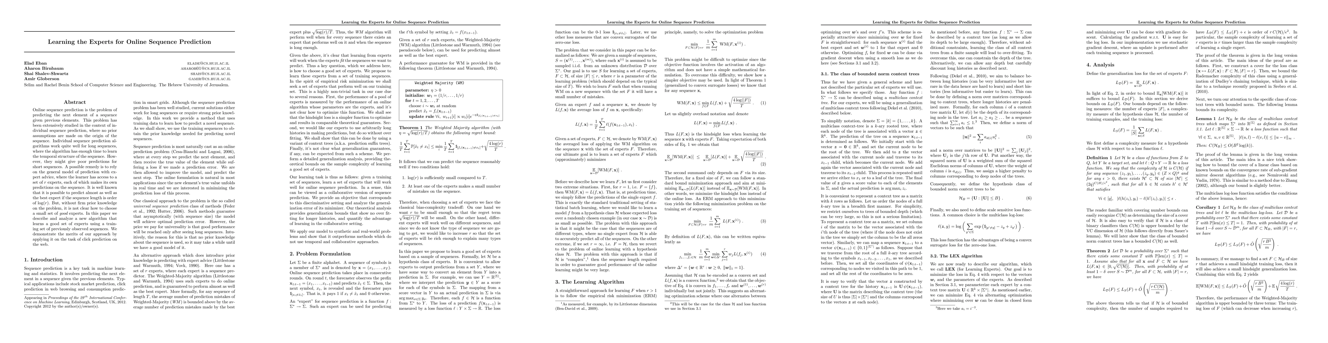 This paper proposes a new algorithm to learn a set of expert predictors for online sequence prediction, particularly for short sequences where individual prediction algorithms struggle. The method leverages a training set of observed sequences to identify effective experts, demonstrating improved performance in web click prediction.