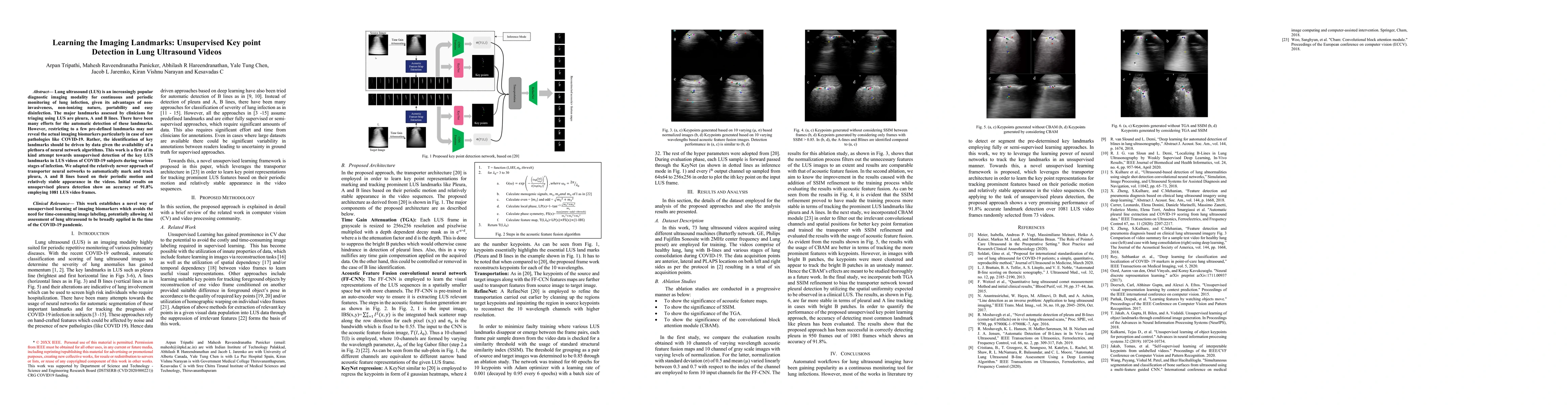 This paper presents an unsupervised method using transporter neural networks to automatically detect key landmarks in lung ultrasound videos, focusing on pleura, A, and B lines, without predefined landmarks. Initial results show 91.8% accuracy in detecting pleura, highlighting the potential for identifying new imaging biomarkers in COVID-19.