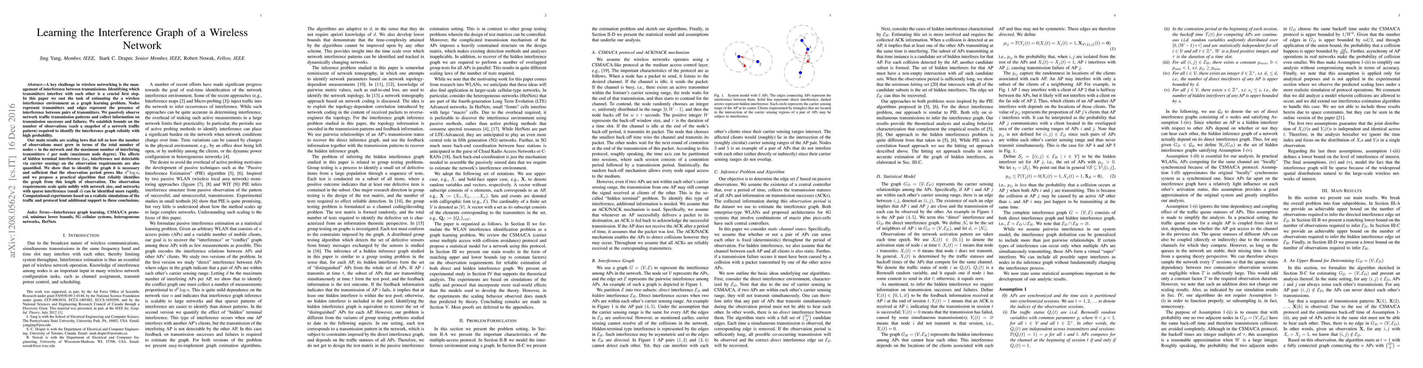 A key challenge in wireless networking is the management of interference between transmissions. Identifying which transmitters interfere with each other is a crucial first step. In this paper we cast the task of estimating the a wireless interference environment as a graph learning problem. Nodes represent transmitters and edges represent the presence of interference between pairs of transmitters. We passively observe network traffic transmission patterns and collect information on transmission successes and failures. We establish bounds on the number of observations (each a snapshot of a network traffic pattern) required to identify the interference graph reliably with high probability. Our main results are scaling laws that tell us how the number of observations must grow in terms of the total number of nodes $n$ in the network and the maximum number of interfering transmitters $d$ per node (maximum node degree). The effects of hidden terminal interference (i.e., interference not detectable via carrier sensing) on the observation requirements are also quantified. We show that to identify the graph it is necessary and sufficient that the observation period grows like $d^2 \log n$, and we propose a practical algorithm that reliably identifies the graph from this length of observation. The observation requirements scale quite mildly with network size, and networks with sparse interference (small $d$) can be identified more rapidly. Computational experiments based on a realistic simulations of the traffic and protocol lend additional support to these conclusions.