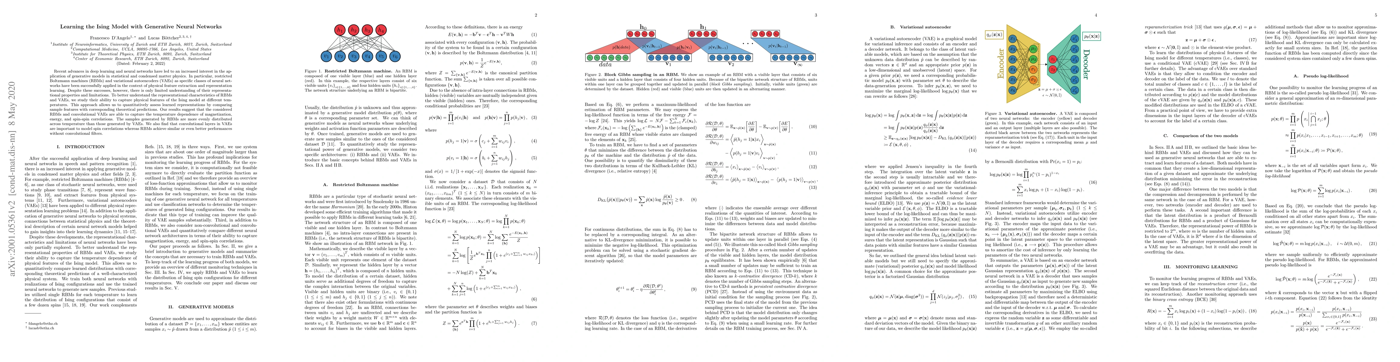 Recent advances in deep learning and neural networks have led to an increased interest in the application of generative models in statistical and condensed matter physics. In particular, restricted Boltzmann machines (RBMs) and variational autoencoders (VAEs) as specific classes of neural networks have been successfully applied in the context of physical feature extraction and representation learning. Despite these successes, however, there is only limited understanding of their representational properties and limitations. To better understand the representational characteristics of RBMs and VAEs, we study their ability to capture physical features of the Ising model at different temperatures. This approach allows us to quantitatively assess learned representations by comparing sample features with corresponding theoretical predictions. Our results suggest that the considered RBMs and convolutional VAEs are able to capture the temperature dependence of magnetization, energy, and spin-spin correlations. The samples generated by RBMs are more evenly distributed across temperature than those generated by VAEs. We also find that convolutional layers in VAEs are important to model spin correlations whereas RBMs achieve similar or even better performances without convolutional filters.