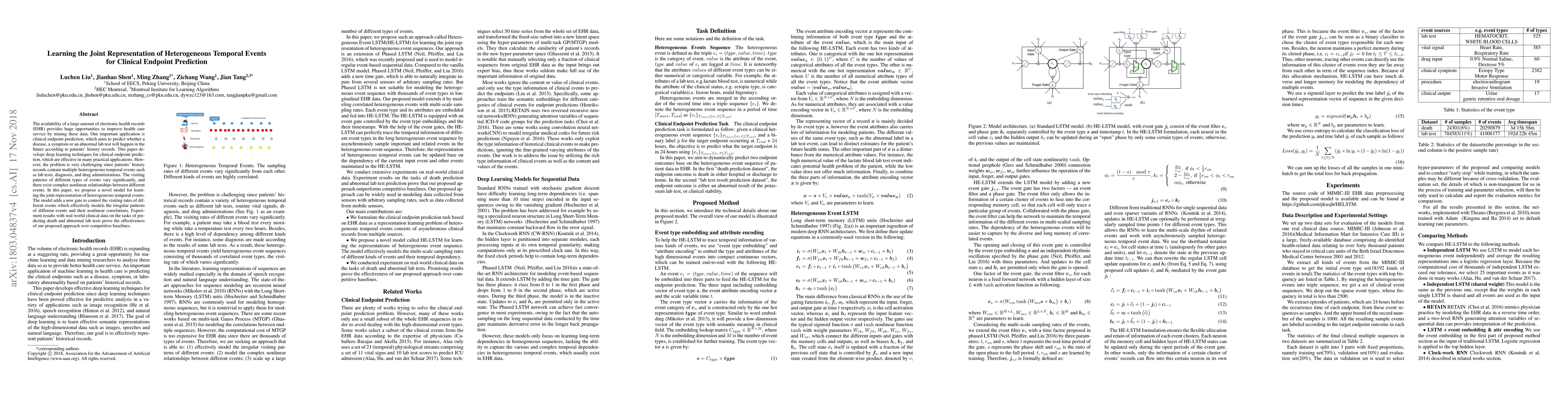 This paper proposes a novel deep learning model to predict clinical endpoints by learning joint representations of heterogeneous temporal events from electronic health records. The model introduces a new gate to manage the varying visiting patterns of different events, capturing their nonlinear correlations, and demonstrates superior performance in predicting death and abnormal lab tests.