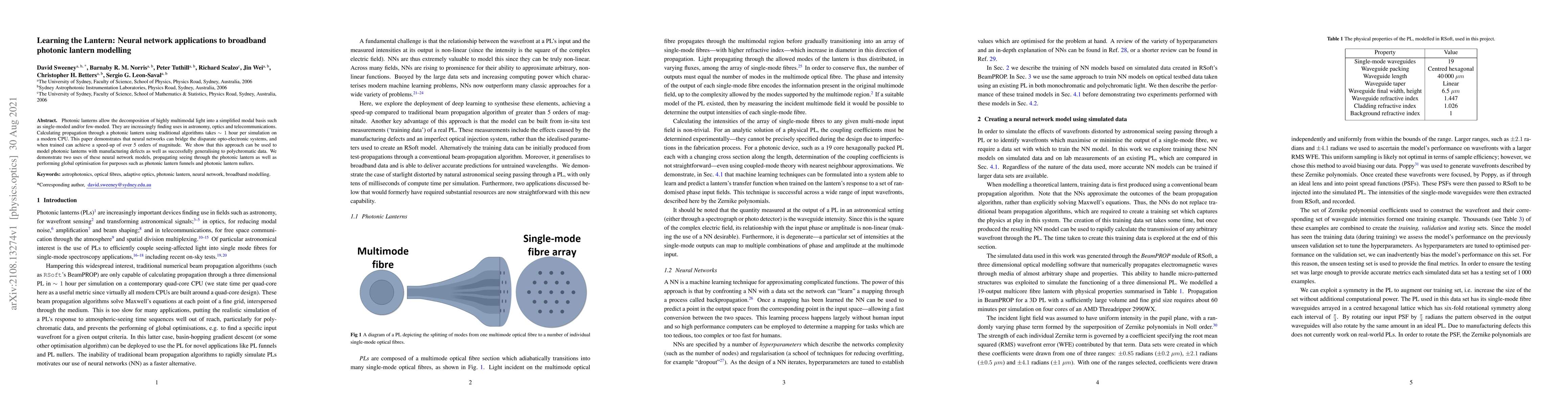Researchers used neural networks to model photonic lanterns, achieving a speedup of over 5 orders of magnitude compared to traditional algorithms. This allows for faster analysis in fields like astronomy, optics, and telecommunications.