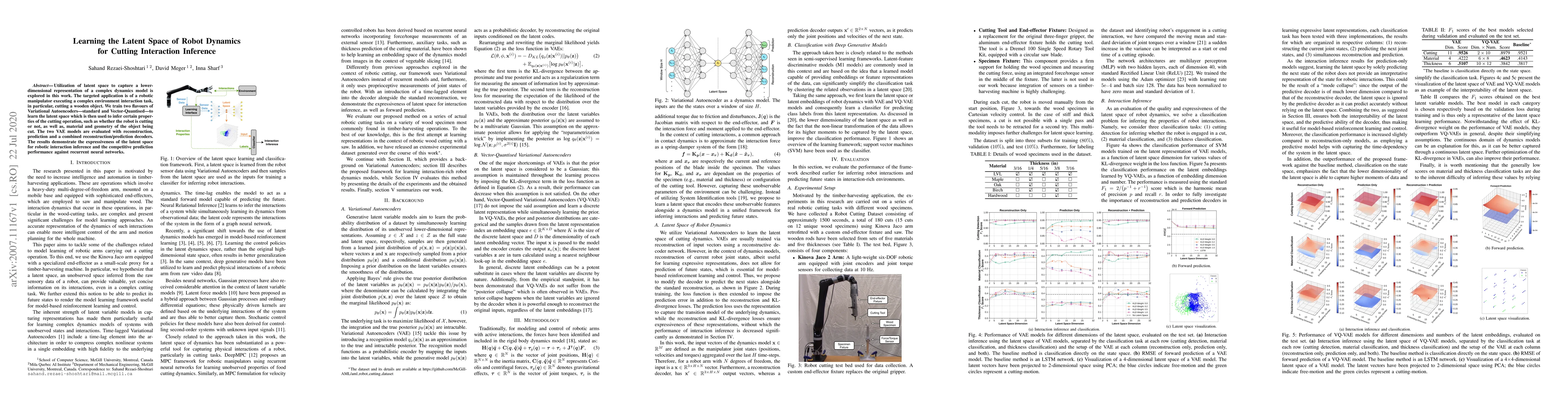 Utilization of latent space to capture a lower-dimensional representation of a complex dynamics model is explored in this work. The targeted application is of a robotic manipulator executing a complex environment interaction task, in particular, cutting a wooden object. We train two flavours of Variational Autoencoders---standard and Vector-Quantised---to learn the latent space which is then used to infer certain properties of the cutting operation, such as whether the robot is cutting or not, as well as, material and geometry of the object being cut. The two VAE models are evaluated with reconstruction, prediction and a combined reconstruction/prediction decoders. The results demonstrate the expressiveness of the latent space for robotic interaction inference and the competitive prediction performance against recurrent neural networks.