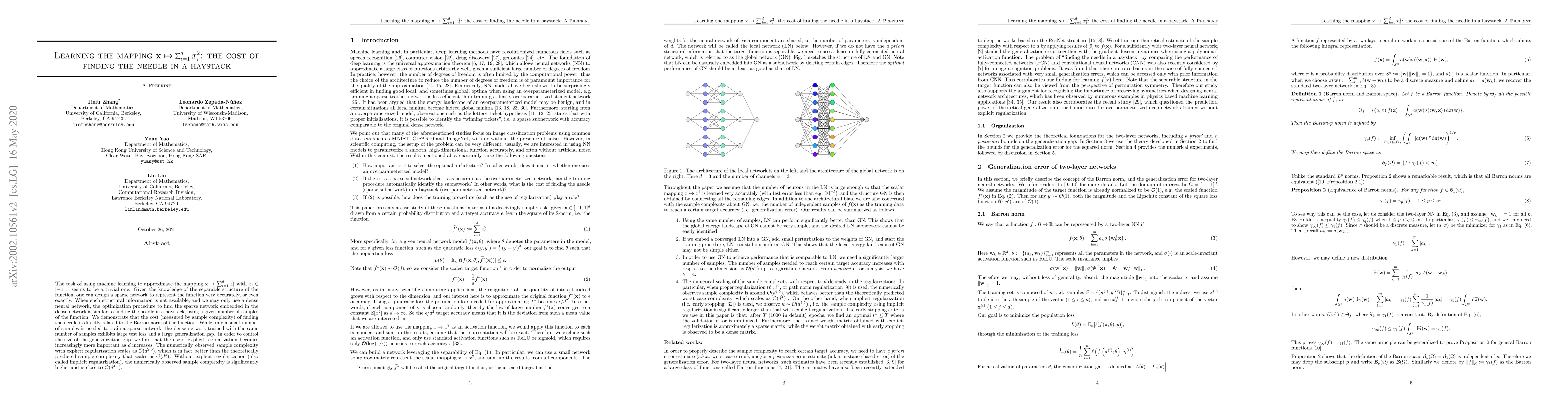 The task of using machine learning to approximate the mapping $\mathbf{x}\mapsto\sum_{i=1}^d x_i^2$ with $x_i\in[-1,1]$ seems to be a trivial one. Given the knowledge of the separable structure of the function, one can design a sparse network to represent the function very accurately, or even exactly. When such structural information is not available, and we may only use a dense neural network, the optimization procedure to find the sparse network embedded in the dense network is similar to finding the needle in a haystack, using a given number of samples of the function. We demonstrate that the cost (measured by sample complexity) of finding the needle is directly related to the Barron norm of the function. While only a small number of samples is needed to train a sparse network, the dense network trained with the same number of samples exhibits large test loss and a large generalization gap. In order to control the size of the generalization gap, we find that the use of explicit regularization becomes increasingly more important as $d$ increases. The numerically observed sample complexity with explicit regularization scales as $\mathcal{O}(d^{2.5})$, which is in fact better than the theoretically predicted sample complexity that scales as $\mathcal{O}(d^{4})$. Without explicit regularization (also called implicit regularization), the numerically observed sample complexity is significantly higher and is close to $\mathcal{O}(d^{4.5})$.
