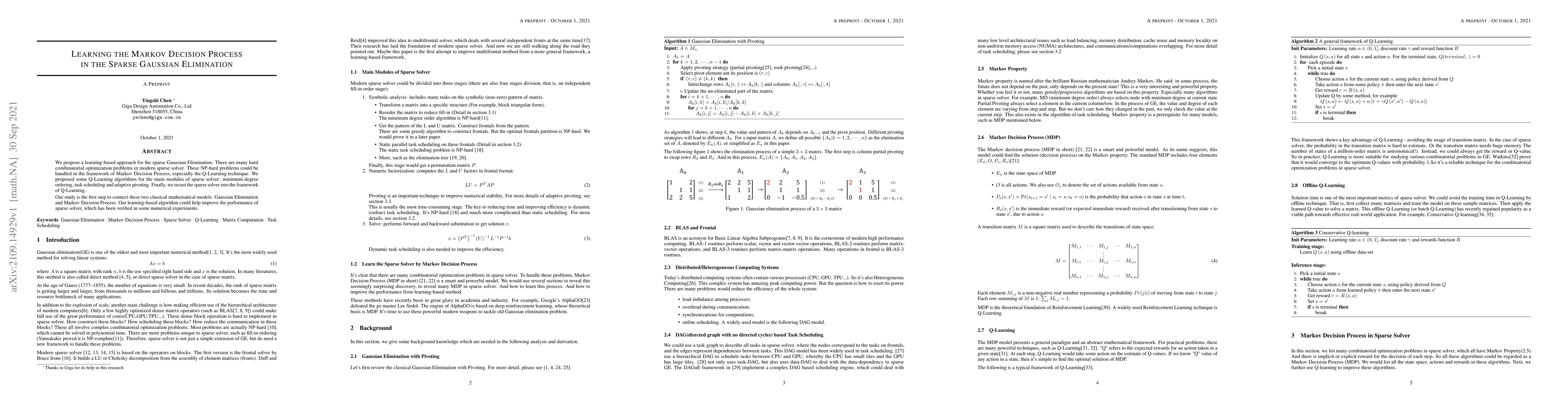 This paper proposes a learning-based approach using Q-Learning techniques to optimize the sparse Gaussian Elimination process, addressing NP-hard problems through Markov Decision Process frameworks. Numerical experiments demonstrate improved performance in sparse solver modules like minimum degree ordering and task scheduling.