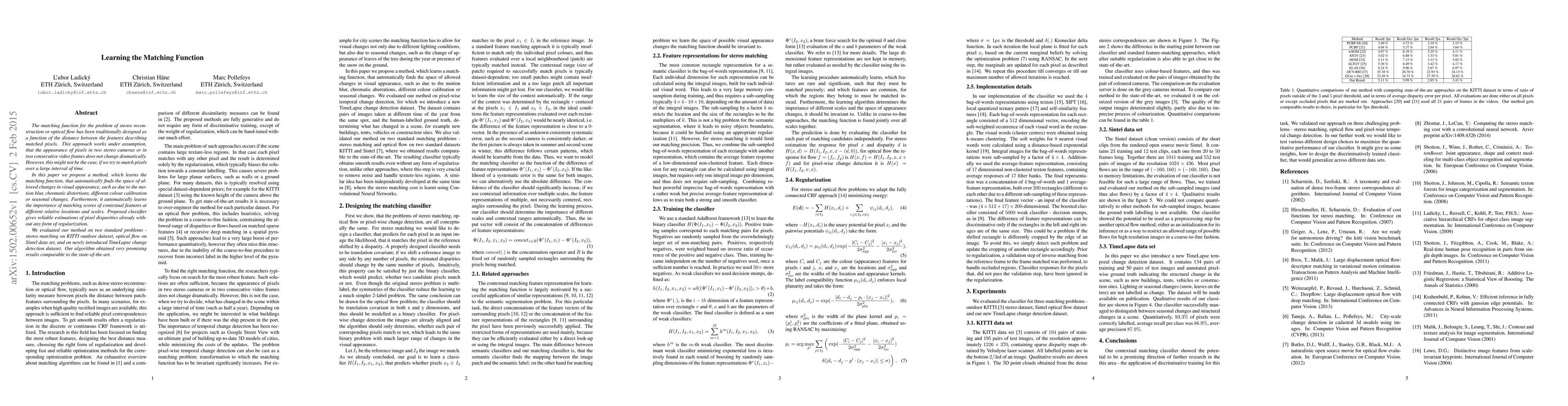 The matching function for the problem of stereo reconstruction or optical flow has been traditionally designed as a function of the distance between the features describing matched pixels. This approach works under assumption, that the appearance of pixels in two stereo cameras or in two consecutive video frames does not change dramatically. However, this might not be the case, if we try to match pixels over a large interval of time. In this paper we propose a method, which learns the matching function, that automatically finds the space of allowed changes in visual appearance, such as due to the motion blur, chromatic distortions, different colour calibration or seasonal changes. Furthermore, it automatically learns the importance of matching scores of contextual features at different relative locations and scales. Proposed classifier gives reliable estimations of pixel disparities already without any form of regularization. We evaluated our method on two standard problems - stereo matching on KITTI outdoor dataset, optical flow on Sintel data set, and on newly introduced TimeLapse change detection dataset. Our algorithm obtained very promising results comparable to the state-of-the-art.