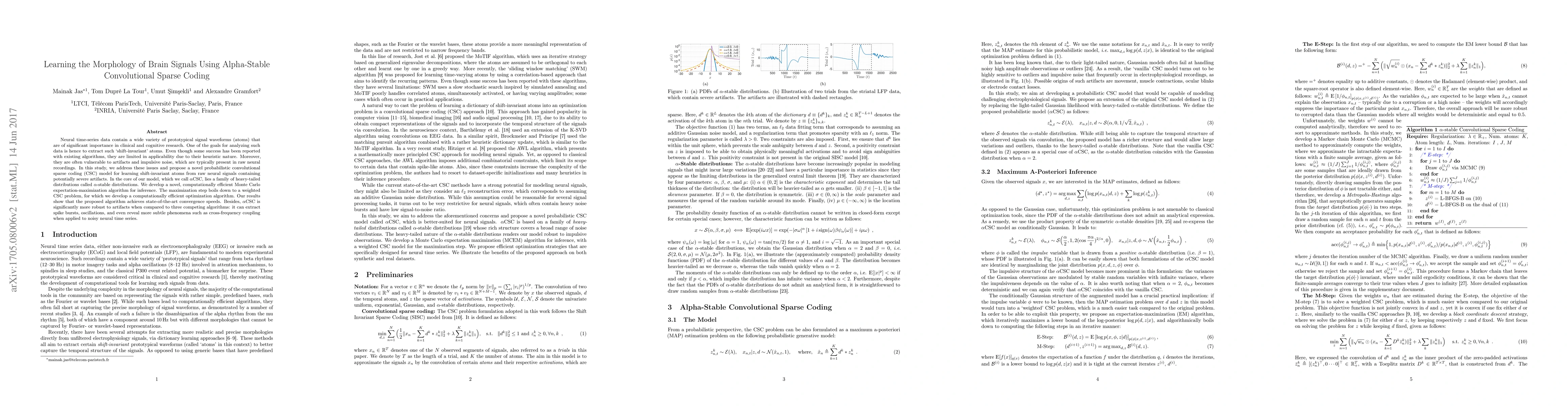 Neural time-series data contain a wide variety of prototypical signal waveforms (atoms) that are of significant importance in clinical and cognitive research. One of the goals for analyzing such data is hence to extract such 'shift-invariant' atoms. Even though some success has been reported with existing algorithms, they are limited in applicability due to their heuristic nature. Moreover, they are often vulnerable to artifacts and impulsive noise, which are typically present in raw neural recordings. In this study, we address these issues and propose a novel probabilistic convolutional sparse coding (CSC) model for learning shift-invariant atoms from raw neural signals containing potentially severe artifacts. In the core of our model, which we call $\alpha$CSC, lies a family of heavy-tailed distributions called $\alpha$-stable distributions. We develop a novel, computationally efficient Monte Carlo expectation-maximization algorithm for inference. The maximization step boils down to a weighted CSC problem, for which we develop a computationally efficient optimization algorithm. Our results show that the proposed algorithm achieves state-of-the-art convergence speeds. Besides, $\alpha$CSC is significantly more robust to artifacts when compared to three competing algorithms: it can extract spike bursts, oscillations, and even reveal more subtle phenomena such as cross-frequency coupling when applied to noisy neural time series.