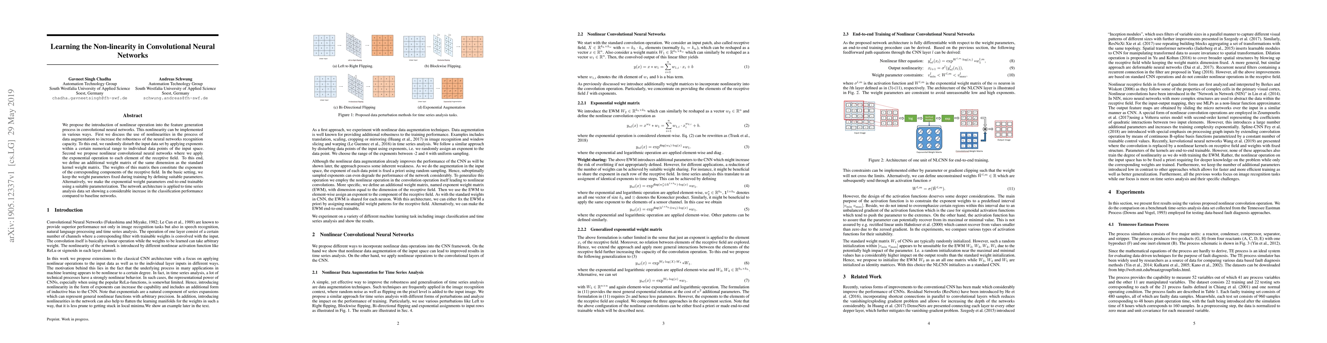 We propose the introduction of nonlinear operation into the feature generation process in convolutional neural networks. This nonlinearity can be implemented in various ways. First we discuss the use of nonlinearities in the process of data augmentation to increase the robustness of the neural networks recognition capacity. To this end, we randomly disturb the input data set by applying exponents within a certain numerical range to individual data points of the input space. Second we propose nonlinear convolutional neural networks where we apply the exponential operation to each element of the receptive field. To this end, we define an additional weight matrix of the same dimension as the standard kernel weight matrix. The weights of this matrix then constitute the exponents of the corresponding components of the receptive field. In the basic setting, we keep the weight parameters fixed during training by defining suitable parameters. Alternatively, we make the exponential weight parameters end-to-end trainable using a suitable parameterization. The network architecture is applied to time series analysis data set showing a considerable increase in the classification performance compared to baseline networks.