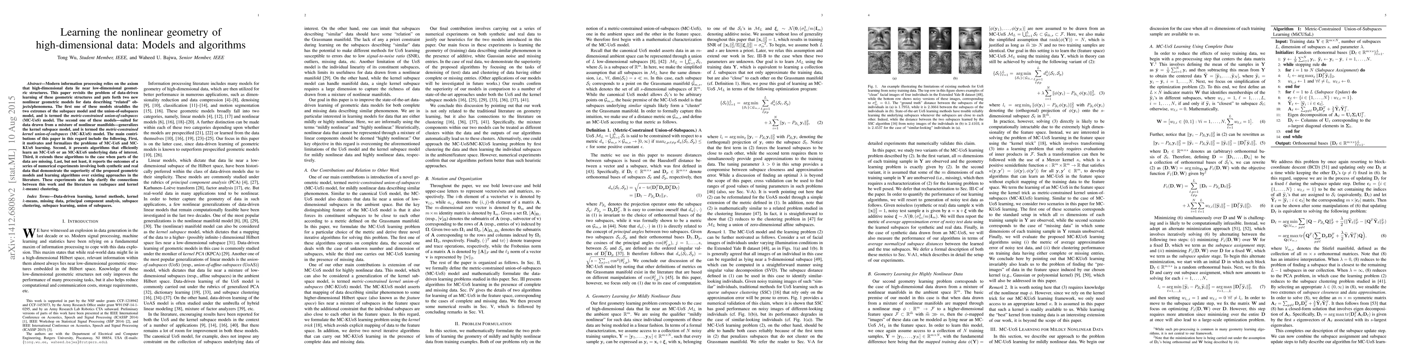 Modern information processing relies on the axiom that high-dimensional data lie near low-dimensional geometric structures. This paper revisits the problem of data-driven learning of these geometric structures and puts forth two new nonlinear geometric models for data describing "related" objects/phenomena. The first one of these models straddles the two extremes of the subspace model and the union-of-subspaces model, and is termed the metric-constrained union-of-subspaces (MC-UoS) model. The second one of these models---suited for data drawn from a mixture of nonlinear manifolds---generalizes the kernel subspace model, and is termed the metric-constrained kernel union-of-subspaces (MC-KUoS) model. The main contributions of this paper in this regard include the following. First, it motivates and formalizes the problems of MC-UoS and MC-KUoS learning. Second, it presents algorithms that efficiently learn an MC-UoS or an MC-KUoS underlying data of interest. Third, it extends these algorithms to the case when parts of the data are missing. Last, but not least, it reports the outcomes of a series of numerical experiments involving both synthetic and real data that demonstrate the superiority of the proposed geometric models and learning algorithms over existing approaches in the literature. These experiments also help clarify the connections between this work and the literature on (subspace and kernel k-means) clustering.
