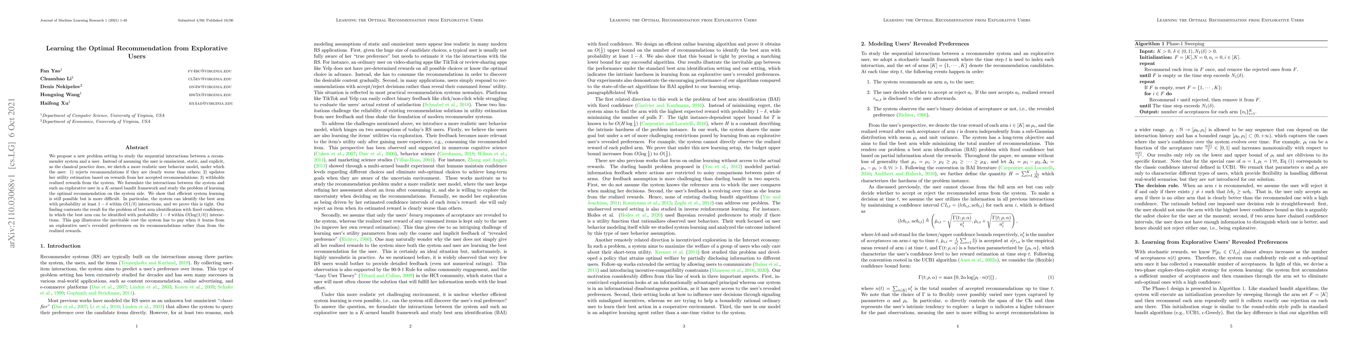 We propose a new problem setting to study the sequential interactions between a recommender system and a user. Instead of assuming the user is omniscient, static, and explicit, as the classical practice does, we sketch a more realistic user behavior model, under which the user: 1) rejects recommendations if they are clearly worse than others; 2) updates her utility estimation based on rewards from her accepted recommendations; 3) withholds realized rewards from the system. We formulate the interactions between the system and such an explorative user in a $K$-armed bandit framework and study the problem of learning the optimal recommendation on the system side. We show that efficient system learning is still possible but is more difficult. In particular, the system can identify the best arm with probability at least $1-\delta$ within $O(1/\delta)$ interactions, and we prove this is tight. Our finding contrasts the result for the problem of best arm identification with fixed confidence, in which the best arm can be identified with probability $1-\delta$ within $O(\log(1/\delta))$ interactions. This gap illustrates the inevitable cost the system has to pay when it learns from an explorative user's revealed preferences on its recommendations rather than from the realized rewards.