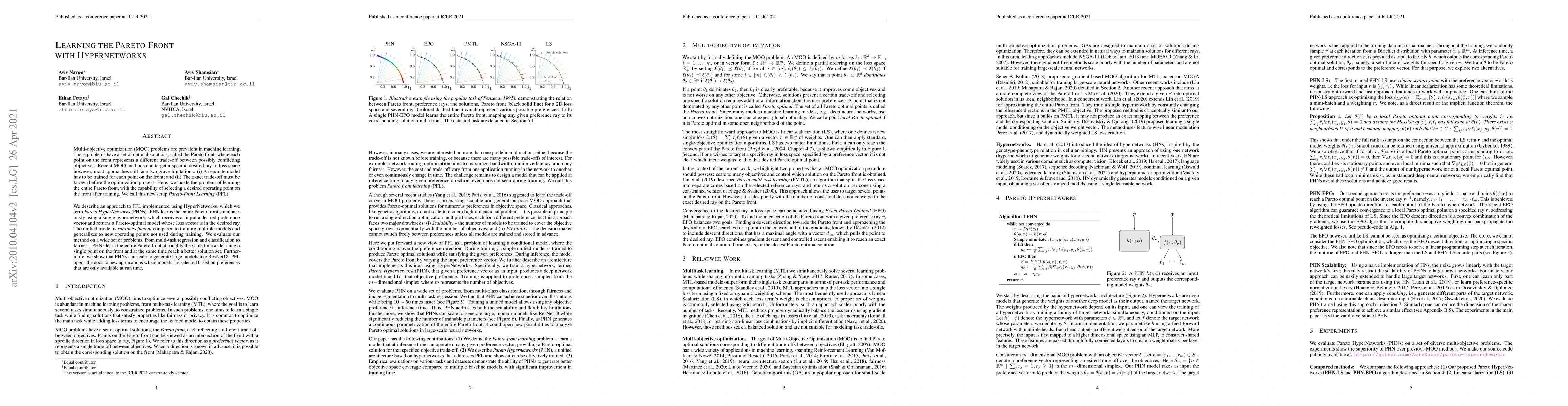 This paper proposes Pareto-Front Learning (PFL) using HyperNetworks termed Pareto HyperNetworks (PHNs) to efficiently learn the entire Pareto front for multi-objective optimization. PHNs enable selecting any desired operating point after training with a single model, addressing the limitations of previous methods that require training separate models or knowing exact trade-offs beforehand.
