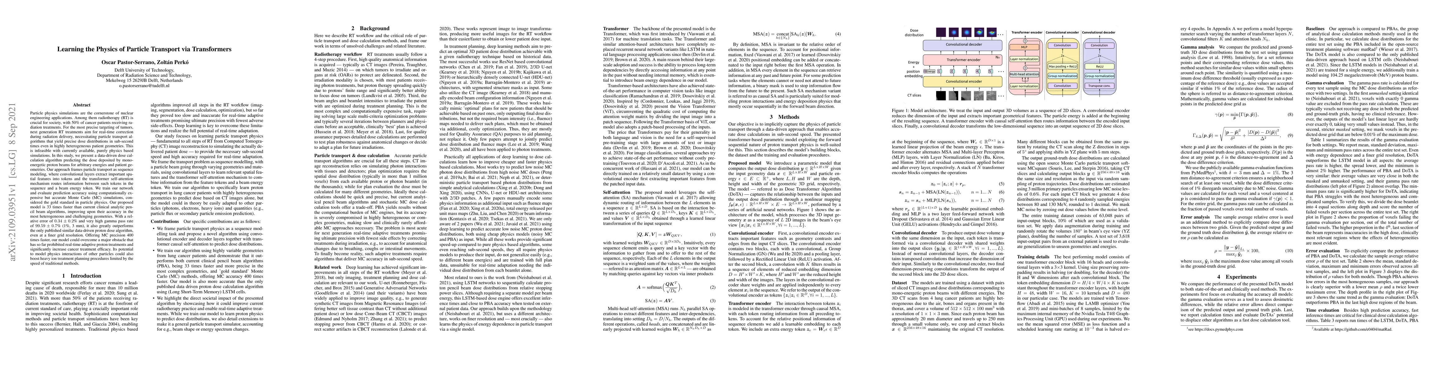 Particle physics simulations are the cornerstone of nuclear engineering applications. Among them radiotherapy (RT) is crucial for society, with 50% of cancer patients receiving radiation treatments. For the most precise targeting of tumors, next generation RT treatments aim for real-time correction during radiation delivery, necessitating particle transport algorithms that yield precise dose distributions in sub-second times even in highly heterogeneous patient geometries. This is infeasible with currently available, purely physics based simulations. In this study, we present a data-driven dose calculation algorithm predicting the dose deposited by mono-energetic proton beams for arbitrary energies and patient geometries. Our approach frames particle transport as sequence modeling, where convolutional layers extract important spatial features into tokens and the transformer self-attention mechanism routes information between such tokens in the sequence and a beam energy token. We train our network and evaluate prediction accuracy using computationally expensive but accurate Monte Carlo (MC) simulations, considered the gold standard in particle physics. Our proposed model is 33 times faster than current clinical analytic pencil beam algorithms, improving upon their accuracy in the most heterogeneous and challenging geometries. With a relative error of 0.34% and very high gamma pass rate of 99.59% (1%, 3 mm), it also greatly outperforms the only published similar data-driven proton dose algorithm, even at a finer grid resolution. Offering MC precision 400 times faster, our model could overcome a major obstacle that has so far prohibited real-time adaptive proton treatments and significantly increase cancer treatment efficacy. Its potential to model physics interactions of other particles could also boost heavy ion treatment planning procedures limited by the speed of traditional methods.