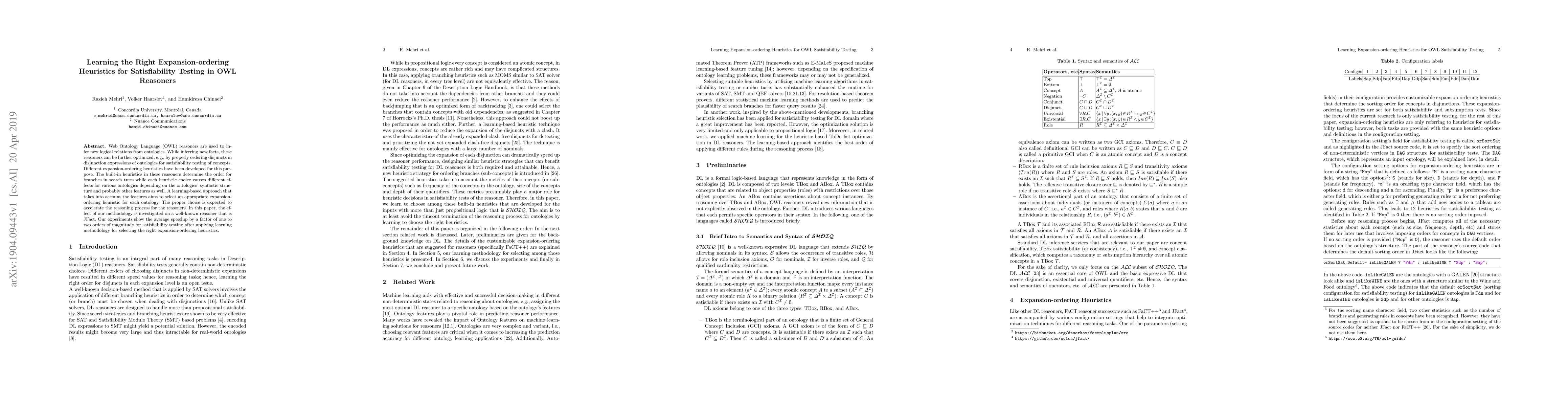 This paper explores learning-based approaches to optimize OWL reasoners by selecting the best expansion-ordering heuristics for satisfiability testing. Experiments on JFact reasoner demonstrate an average speedup of one to two orders of magnitude using the proposed methodology.
