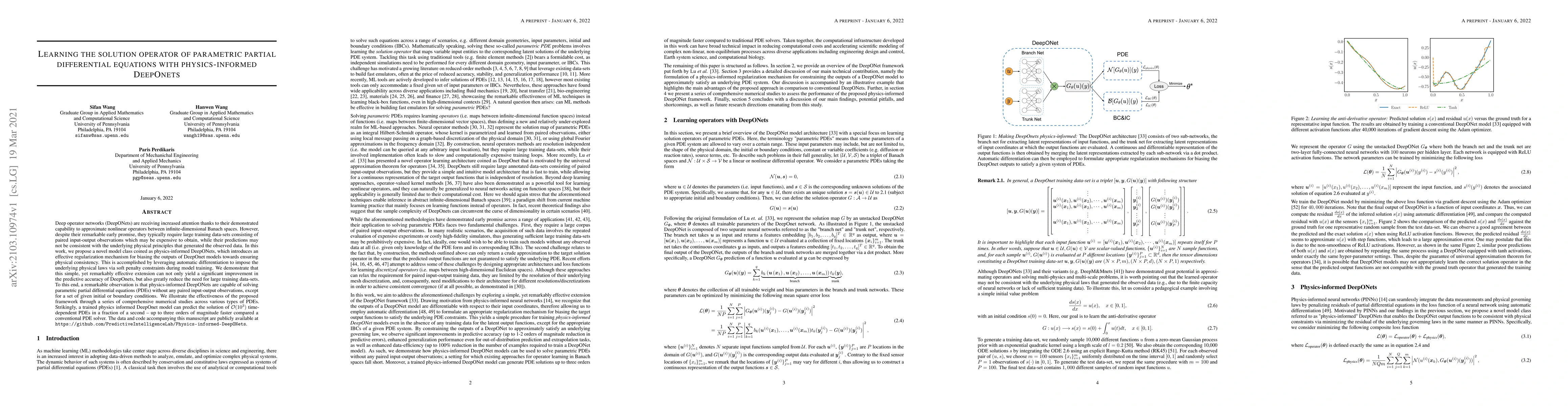 This paper proposes physics-informed DeepONets, a novel model that enhances DeepONets by incorporating physical laws through soft penalty constraints, significantly improving predictive accuracy and reducing the need for large training datasets. The method can solve parametric PDEs without paired observations, achieving predictions up to three orders of magnitude faster than conventional solvers.
