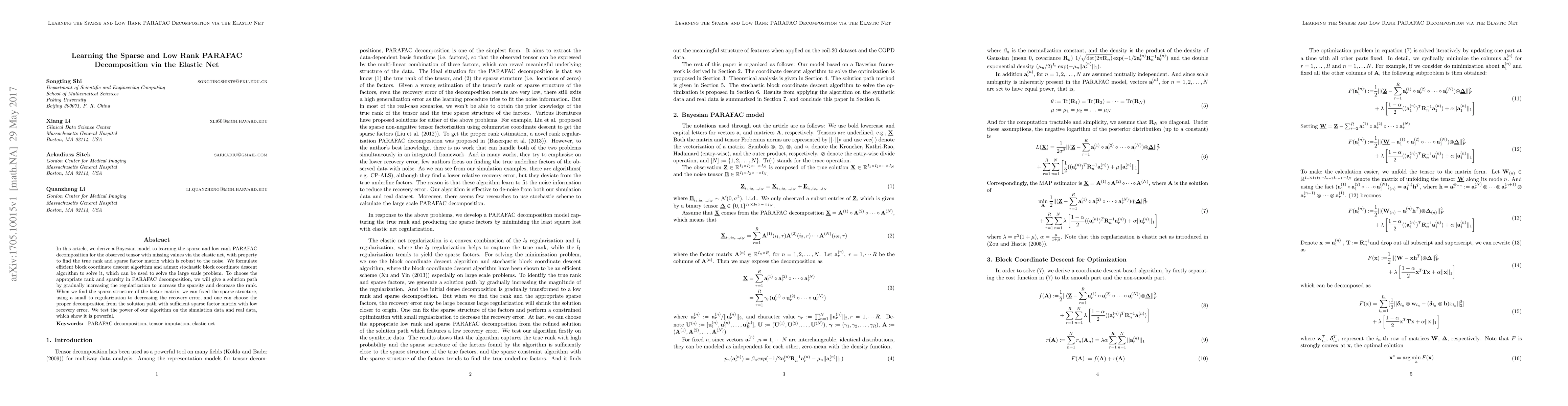 This paper proposes a Bayesian model for learning sparse and low-rank PARAFAC decomposition using the elastic net, enabling the identification of true rank and sparse factor matrices robust to noise. The authors develop efficient algorithms for large-scale problems and demonstrate their effectiveness through simulations and real data.