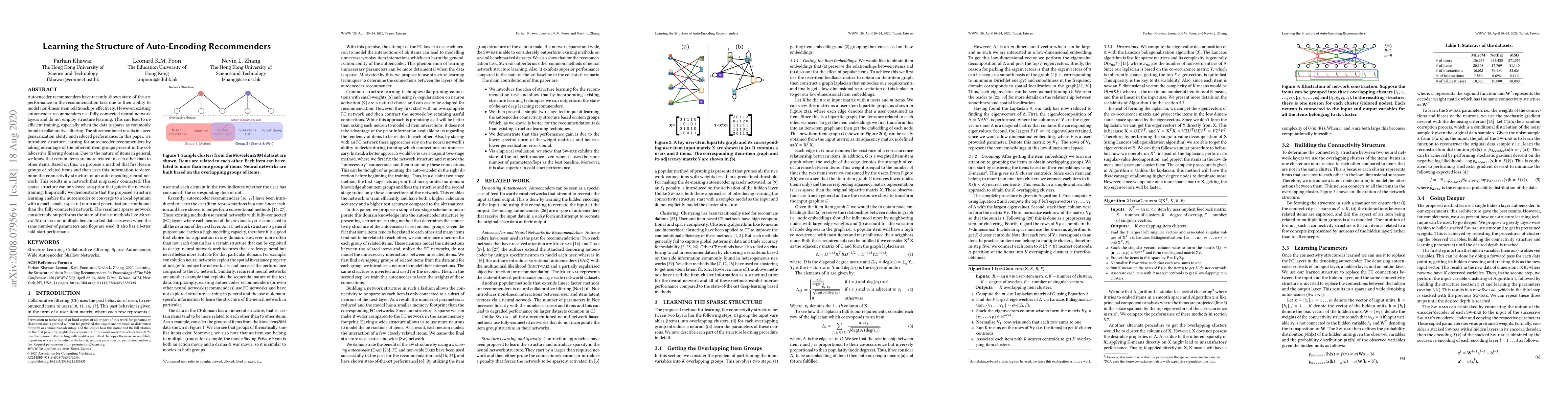 This paper introduces a method for structure learning in autoencoder recommenders to improve performance in collaborative filtering tasks. By leveraging item groups to create a sparsely connected neural network, the proposed method enhances generalization and outperforms state-of-the-art methods, achieving better results with fewer parameters and improved cold-start performance.