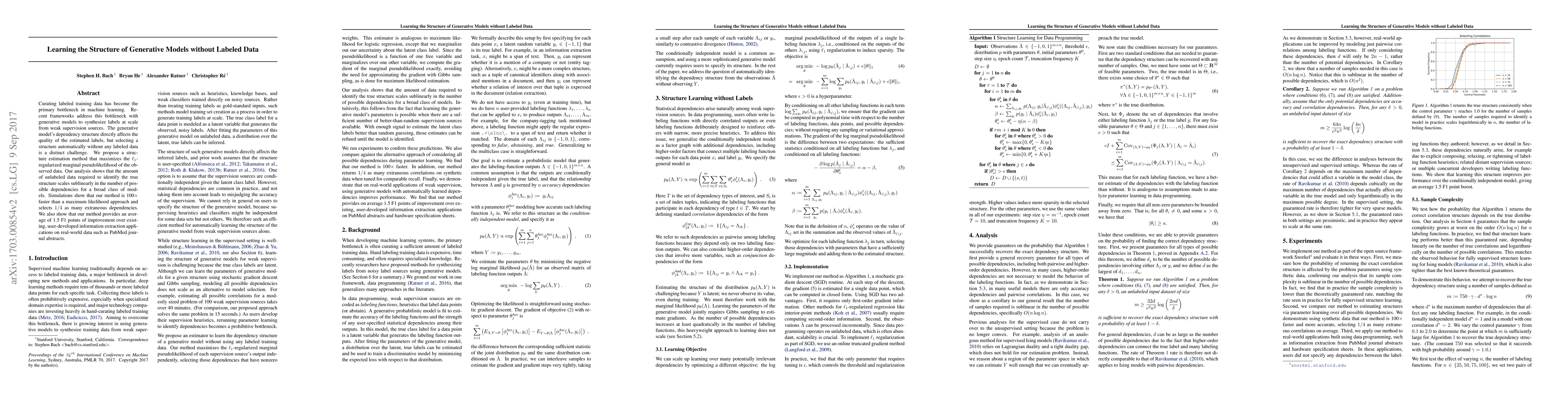 This paper proposes a method to automatically determine the structure of generative models without labeled data, optimizing an $\ell_1$-regularized marginal pseudolikelihood. The approach requires sublinearly less unlabeled data compared to traditional methods and demonstrates significant improvements in speed and accuracy over existing techniques.