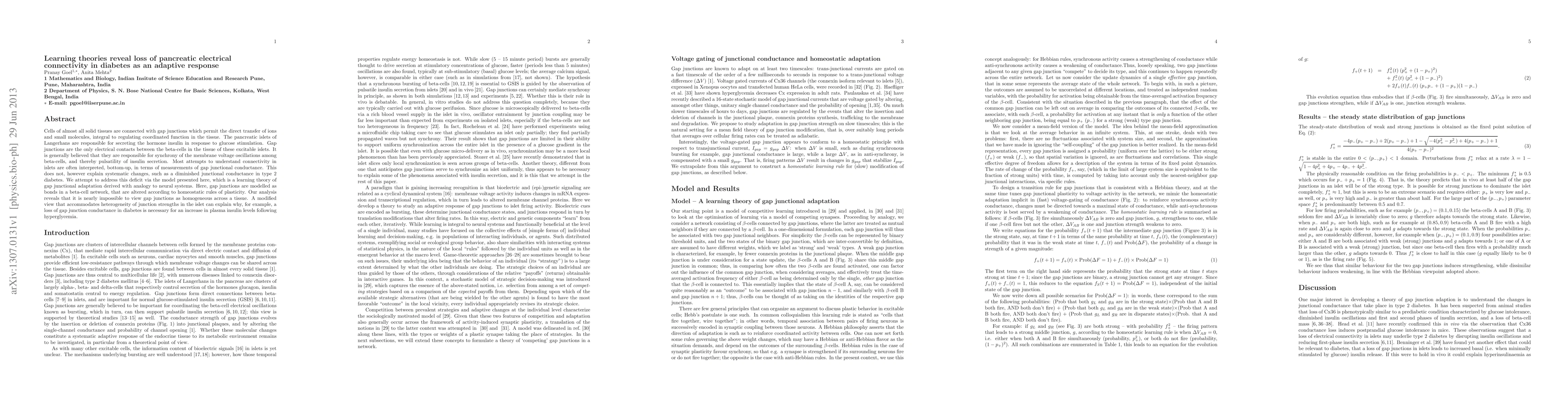 Cells of almost all solid tissues are connected with gap junctions which permit the direct transfer of ions and small molecules, integral to regulating coordinated function in the tissue. The pancreatic islets of Langerhans are responsible for secreting the hormone insulin in response to glucose stimulation. Gap junctions are the only electrical contacts between the beta-cells in the tissue of these excitable islets. It is generally believed that they are responsible for synchrony of the membrane voltage oscillations among beta-cells, and thereby pulsatility of insulin secretion. Most attempts to understand connectivity in islets are often interpreted, bottom-up, in terms of measurements of gap junctional conductance. This does not, however explain systematic changes, such as a diminished junctional conductance in type 2 diabetes. We attempt to address this deficit via the model presented here, which is a learning theory of gap junctional adaptation derived with analogy to neural systems. Here, gap junctions are modelled as bonds in a beta-cell network, that are altered according to homeostatic rules of plasticity. Our analysis reveals that it is nearly impossible to view gap junctions as homogeneous across a tissue. A modified view that accommodates heterogeneity of junction strengths in the islet can explain why, for example, a loss of gap junction conductance in diabetes is necessary for an increase in plasma insulin levels following hyperglycemia.